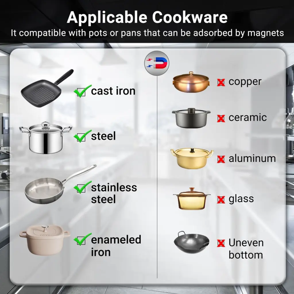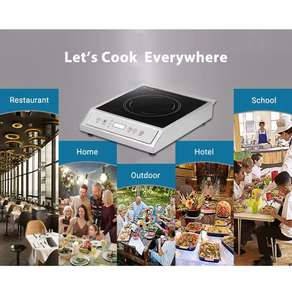 Unmatched Energy Efficiency Experience exceptional energy savings with the Induction Cooktop. Featuring 8 precise power levels (300-1800W) and 8 temperature settings (140°F–465°F), this induction cooker achieves up to 83% energy efficiency—significantly higher than traditional gas or electric stoves. Its advanced 8-inch electromagnetic coil ensures rapid and even heating, shortening cooking time while providing reliable performance. Compatible with cookware featuring base diameters between 12-26cm. Continuous and Precise Heating Designed for versatile culinary tasks, this induction cooktop supports continuous heating at all settings—ideal for gently melting chocolate, warming milk, or searing steak. With a persistent working circuit and a 10-hour timer function. Dual IGBT & Safety Protection Engineered with dual IGBT modules for improved electrical efficiency and performance, this induction cooktop also incorporates comprehensive safety features including a residual heat indicator, over-temperature protection, and automatic shutdown functions—providing peace of mind whether at home or in a professional setting. Intuitive Touch Control with LCD Operate with ease using the sensitive sensor touch panel and large LCD display. The angled interface offers clear visibility even from a distance, making it effortless to monitor and adjust settings during cooking. Durable & Professional Build Constructed with robust stainless steel capable of supporting up to 100 lbs, this induction stove is built for high-capacity usage in commercial and professional environments such as restaurants, industrial kitchens, and food service facilities. The combination of a black glass ceramic surface and stainless steel housing offers both elegance and extreme durability. Effortless Cleaning & Advanced Cooling The flameless induction system prevents food from sticking to the smooth glass surface, allowing quick and easy cleaning. Additionally, the built-in 7-blade cooling fan and rear ventilation openings ensure efficient heat dissipation, maintaining a comfortable kitchen environment.