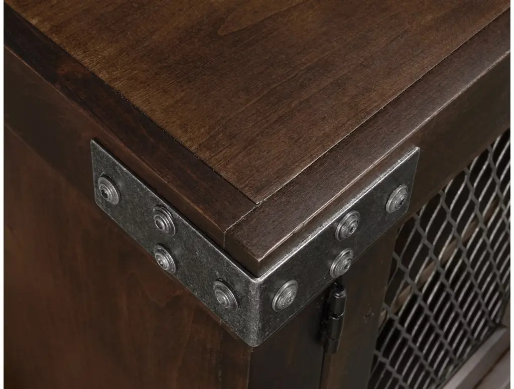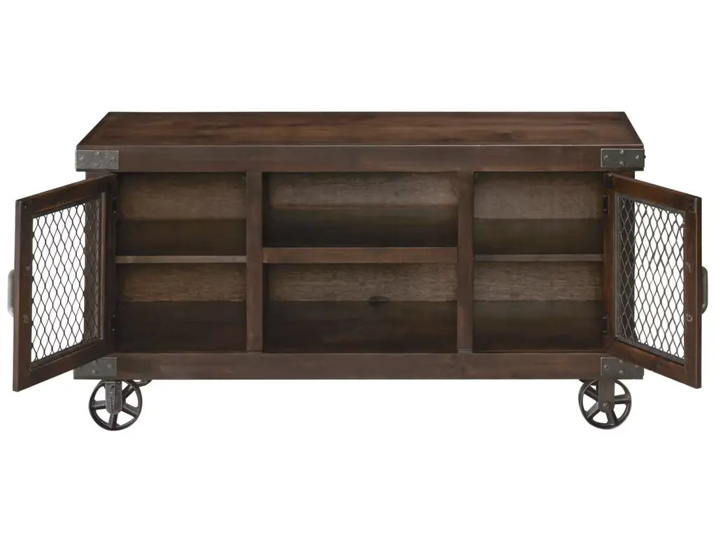 Unique yet classically timeless, the Industrial 55" Console is sure to make a statement in your entertainment room. The wired door fronts, metal brackets, and casters add to its industrial natural look and give a vintage touch to your interior. The open center shelves offer an ideal spot for your electronic components, while the spacious top is perfect to hold your flat-screen TV. The two doors feature one shelf behind each to accommodate all your accessories with ease. The cord-access holes add to its convenience. Available in other finishes.