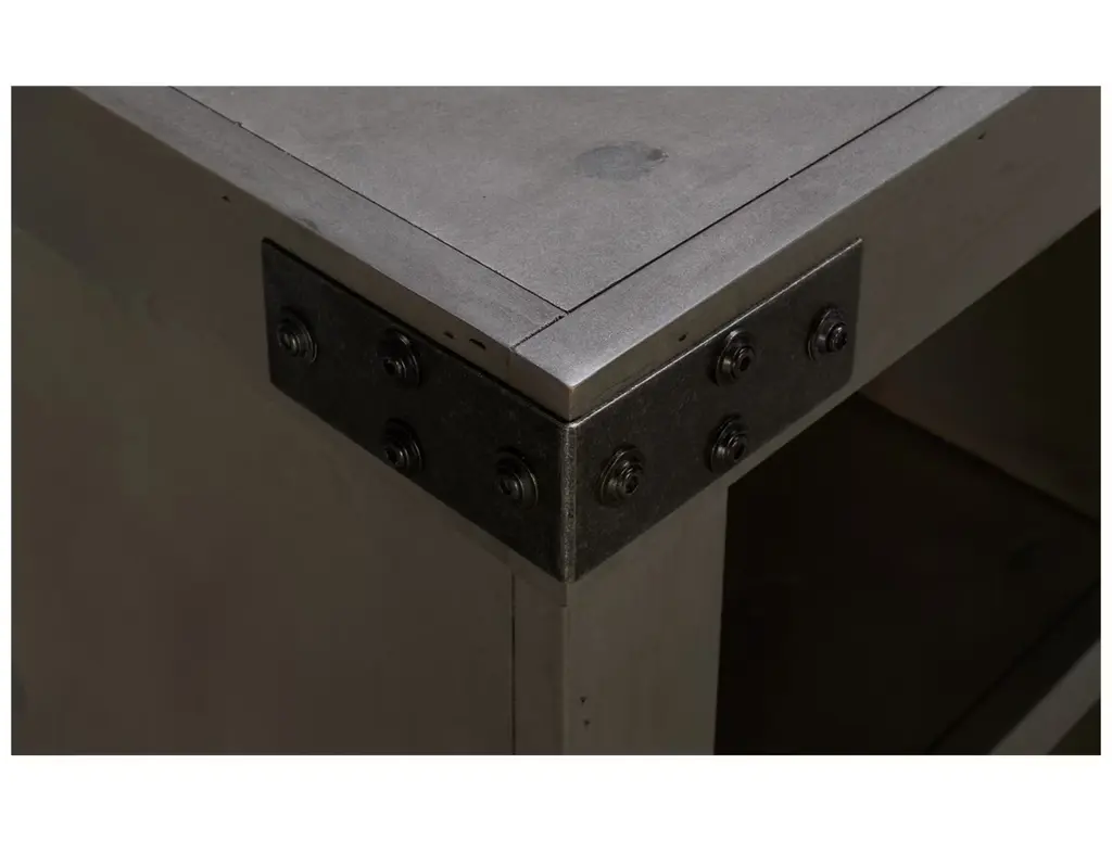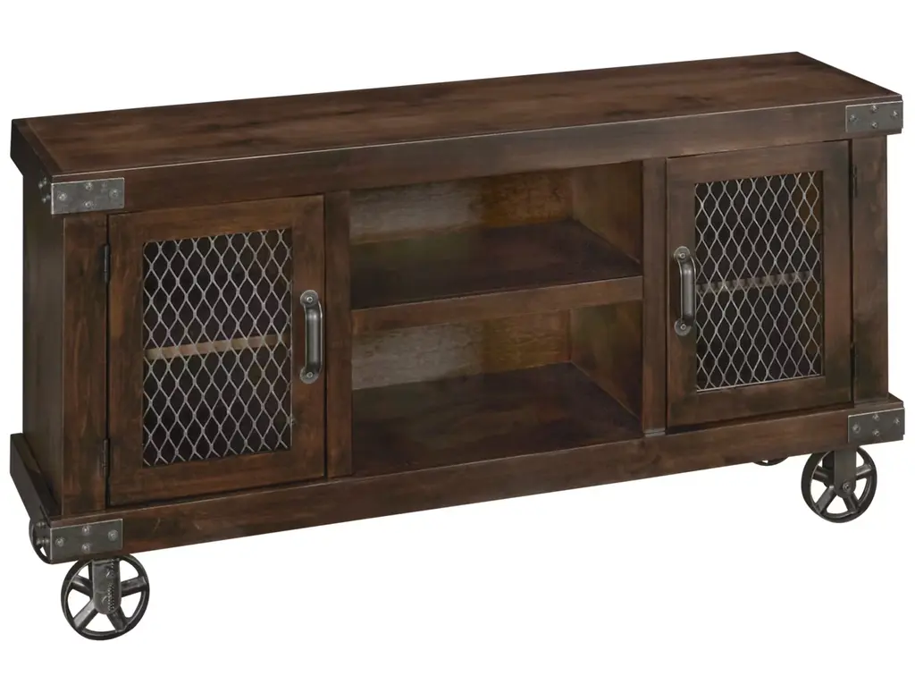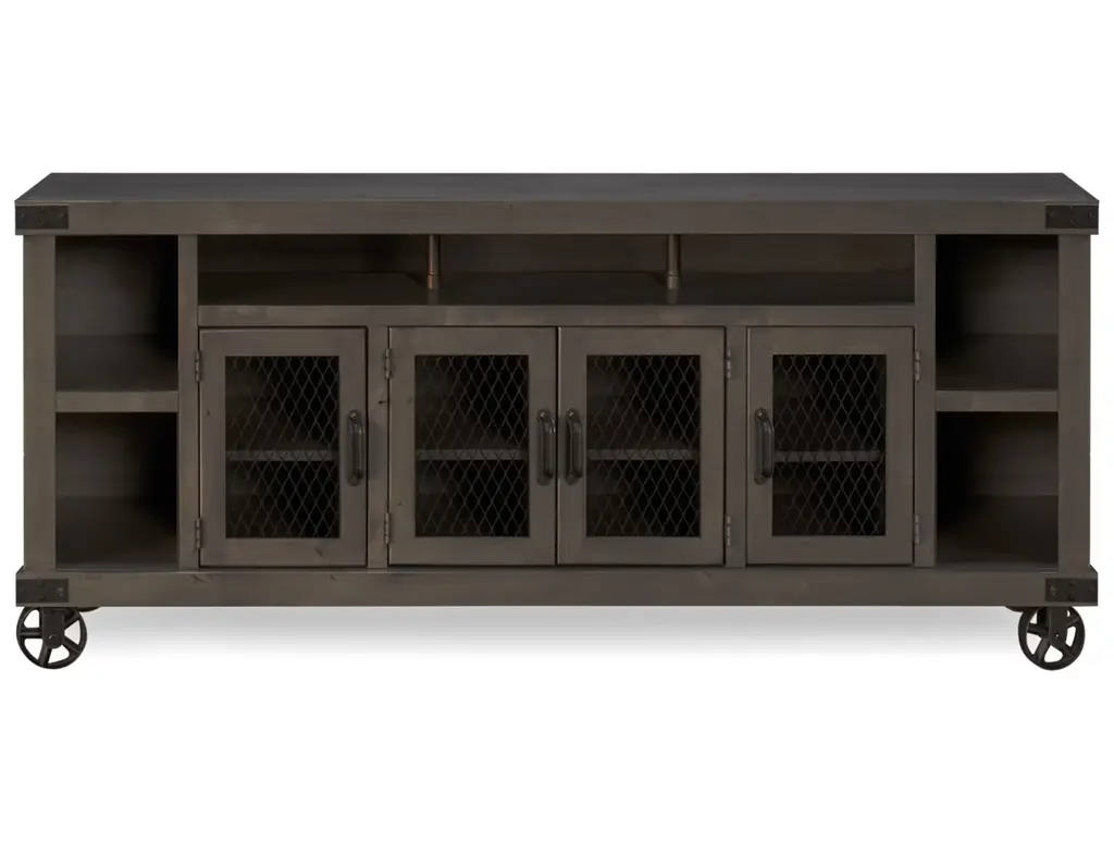 The Aspen Industrial 96” Console brings a Machine Age vibe to your space with its metal edges with exposed metal rivets. The front features four doors with latticed details that open to reveal shelves for storage. There is also a cutout at the back to organize electronics wires. Pewter-finish hardware completes the industrial look of this console, along with large casters for easy mobility. Available in other finishes.