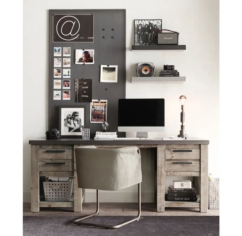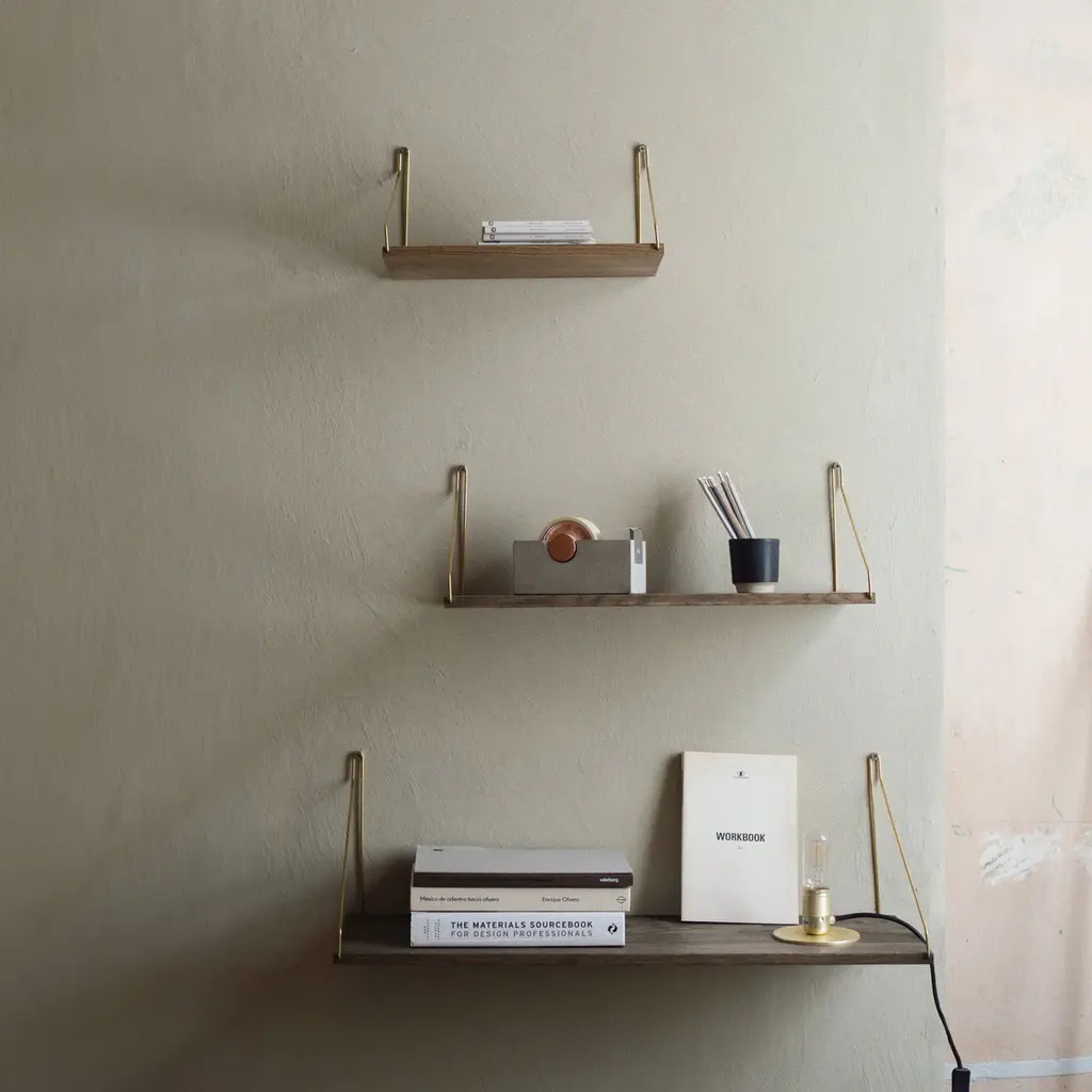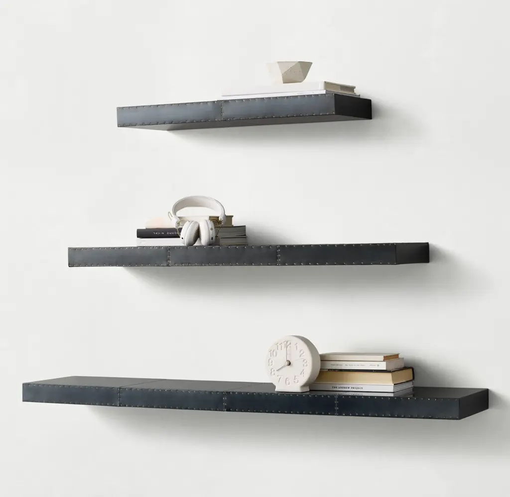 Modern by design, with an architectural sensibility. Mounting flush against the wall, our metal shelf cantilevers for a streamlined display, while exposed nailheads and an aged finish lend a vintage-industrial aesthetic.