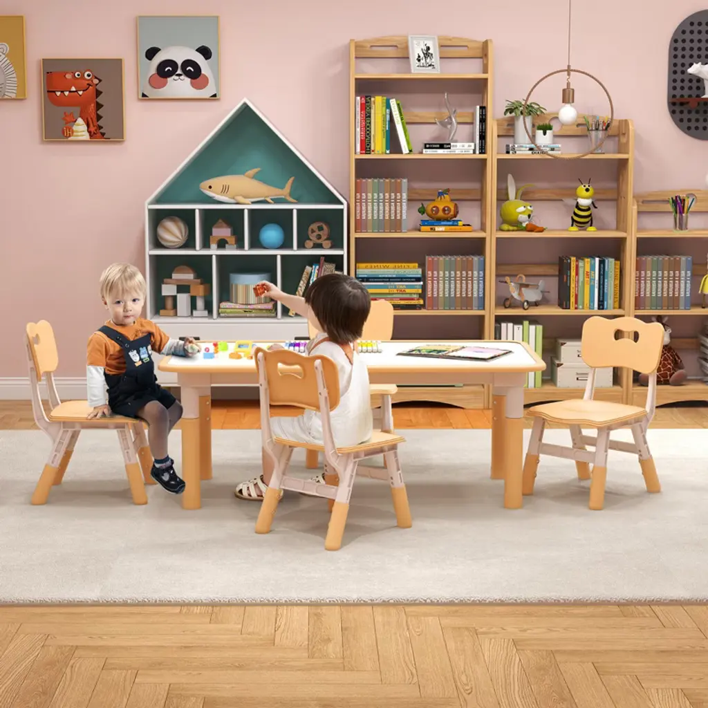 Our toddler table and chair sets are comfortable with ergonomic backs and spacious seats. The Level 7 adjustable table and level 3 adjustable chair are suitable for children of different heights to accompany them as they grow. When not in use, they can be stacked to save space. In addition, children can use watercolors to draw on the graffiti tabletop.Color: Natural Materials: PP, Engineered Wood Size of Table: 47" x 23.5" x 18.9"-23.6" (W x D x H) Size of Each Chair: 12.5" x 14" x 20"-21.6" (W x D x H) Size of Seat: 12.5" x 12" (W x D) Seat Height Range: 10.2"/11"/11.8" Net Weight of Table: 25.5 lbs Net Weight of Each Chair: 3.5 lbs Weight Capacity of Table: 110 lbs Weight Capacity of Each Chair: 110 lbs Recommended Ages: 18+ Months Old Package Includes: 1 x Table 4 x Chairs 1 x Instruction