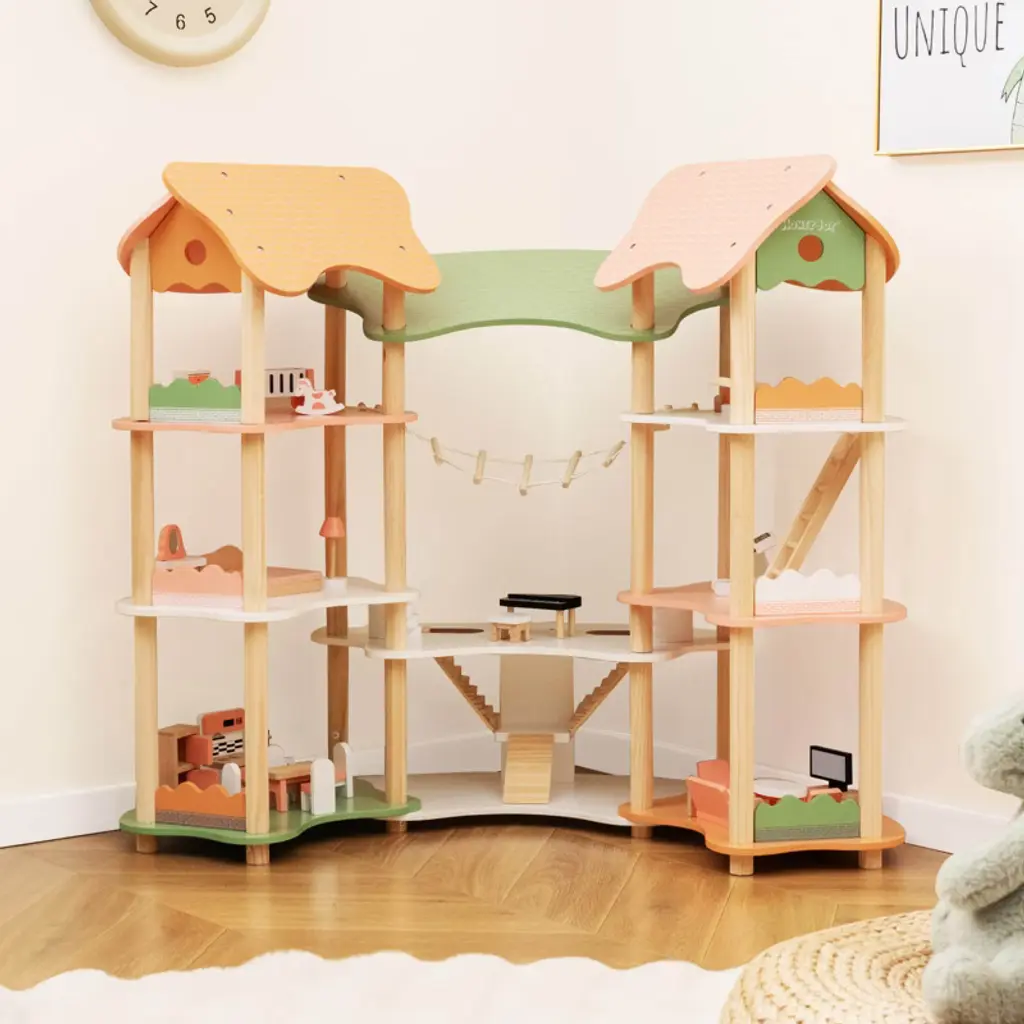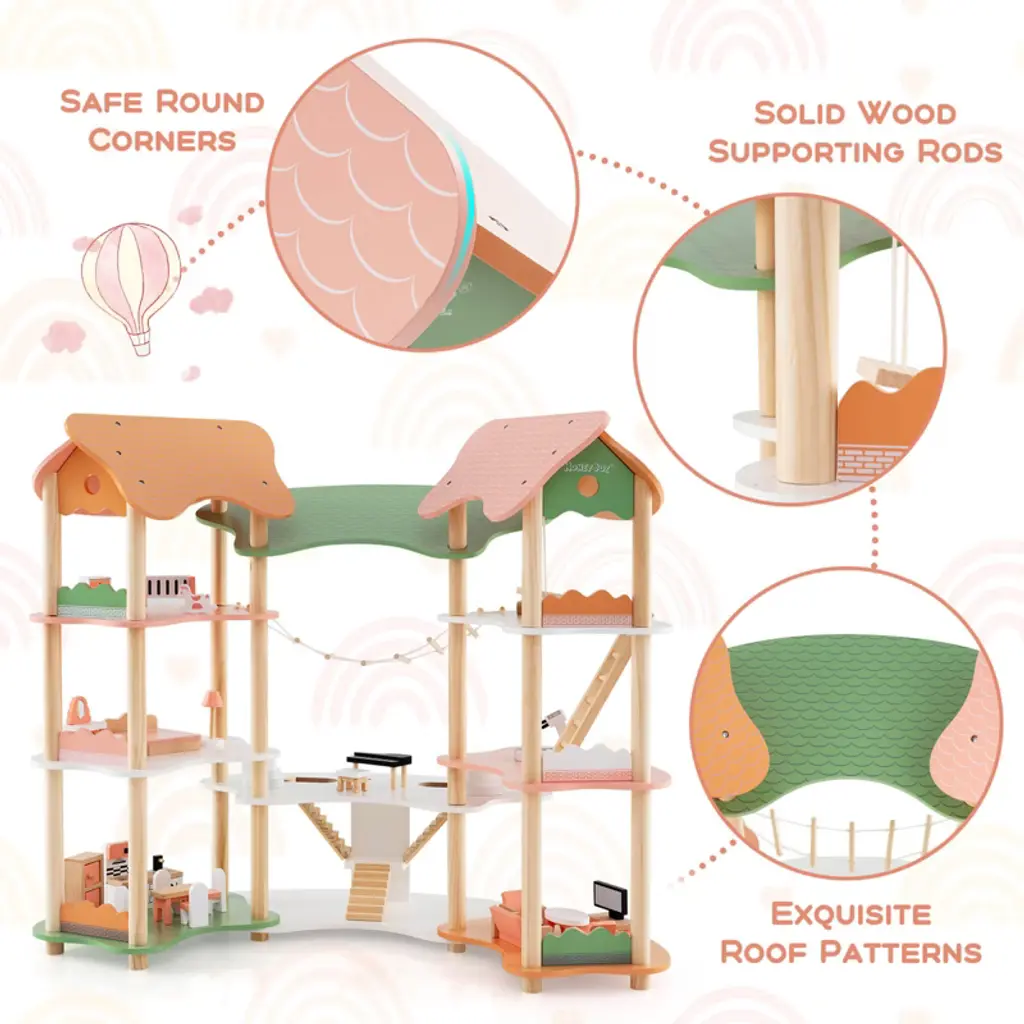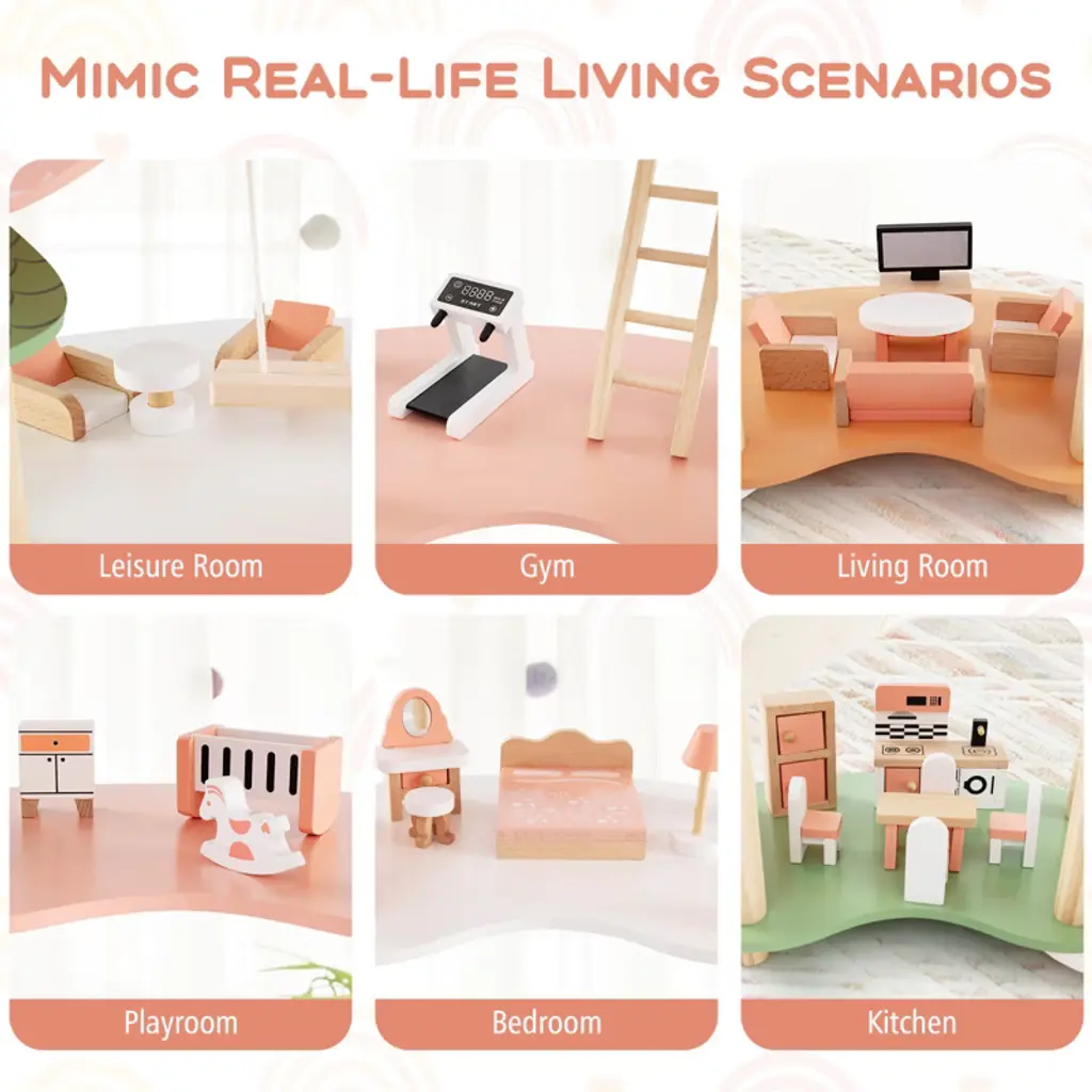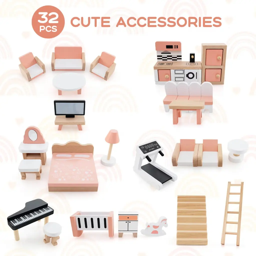 Infans Kids Wooden Dollhouse Aged 3-8 Years Old W/32pcs Realistic Furniture Accessories