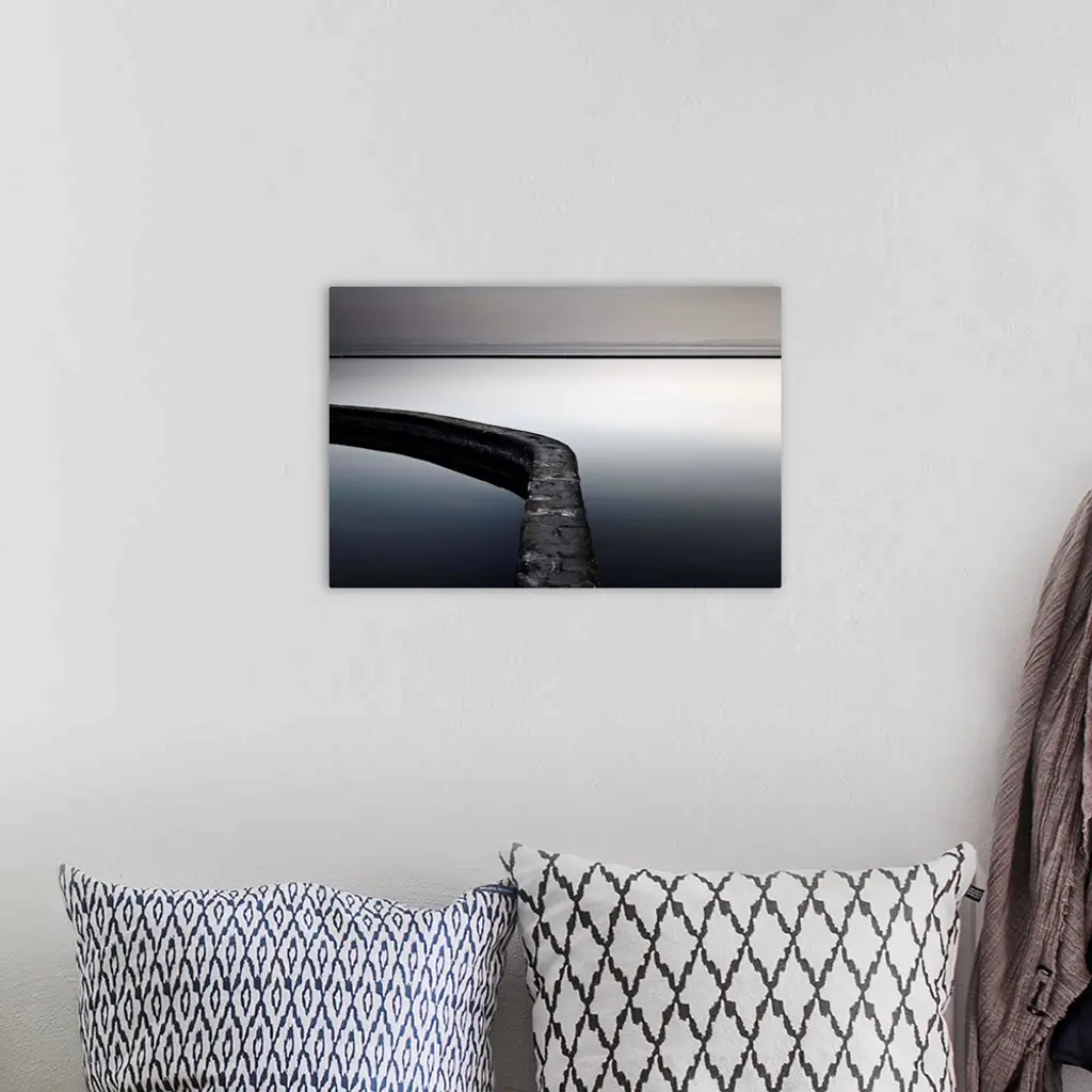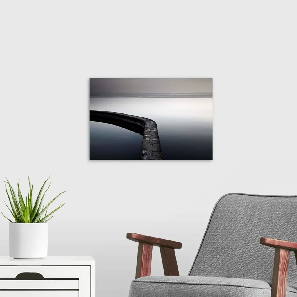 A monochrome zen-like minimalist image of mirror calm water in a pool with a curving wall and a distant horizon.