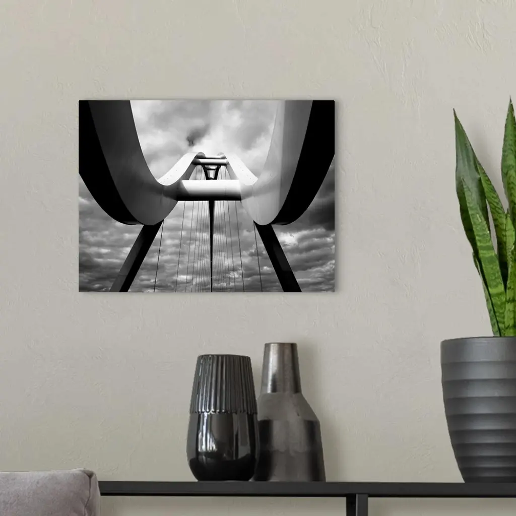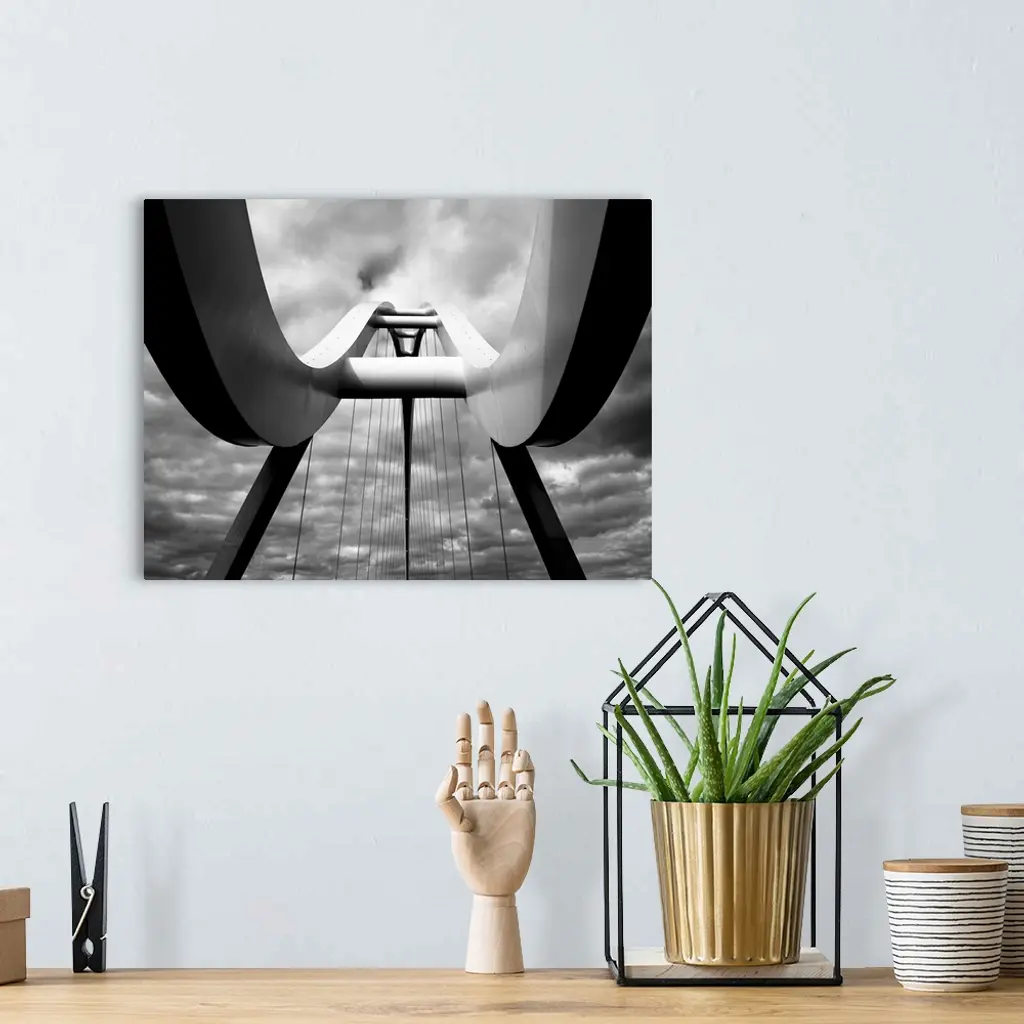A black and white photograph taken from below the infinity bridge in the UK and looking up to the top of it.