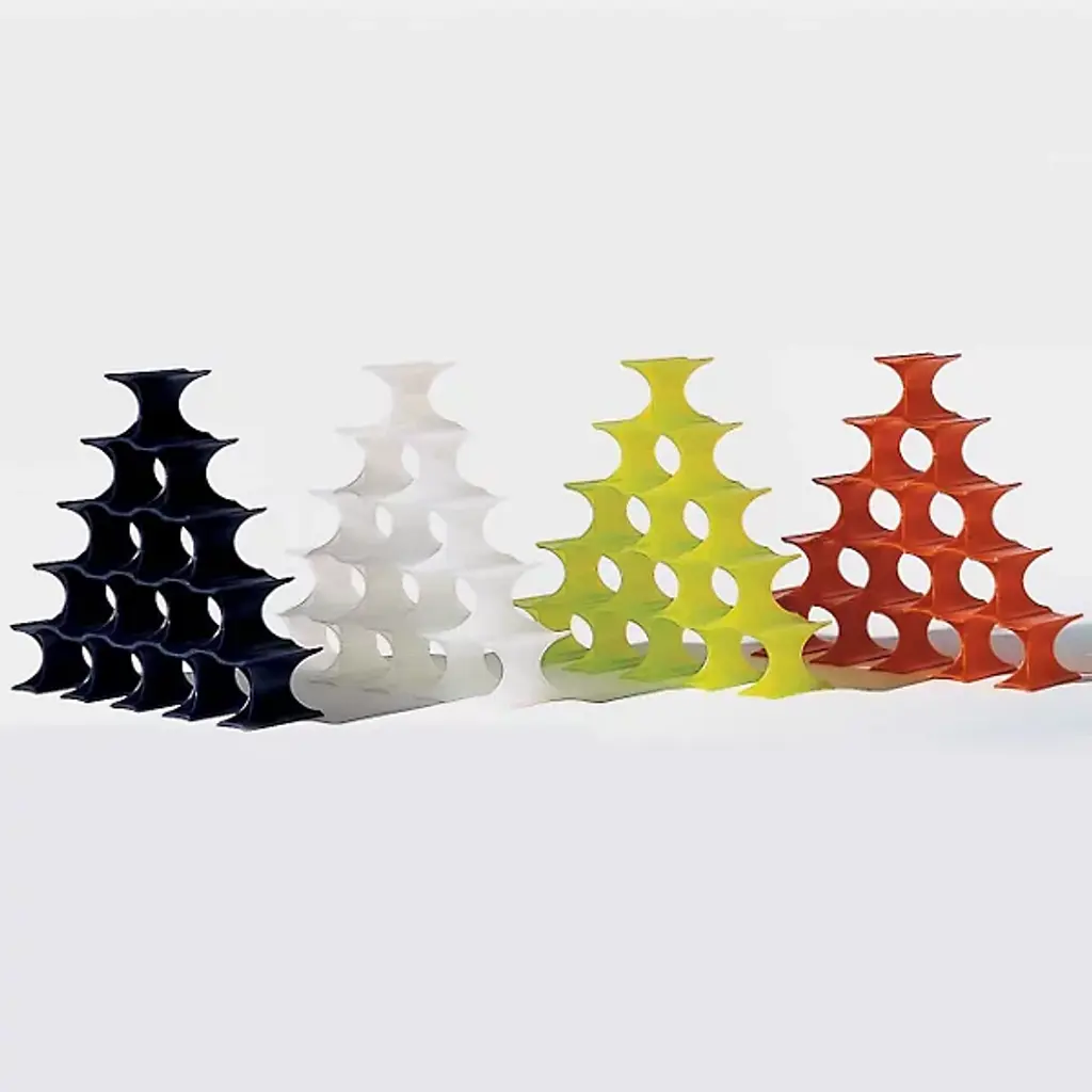 The Kartell Infinity Winerack is a colorful and curvilinear modular bottle-holder. The elements that form the bottle-holder can be fastened together to form an indefinite number of rings inside of which bottles may be stored. The Infinity Winerack features batch-dyed polypropylene material.