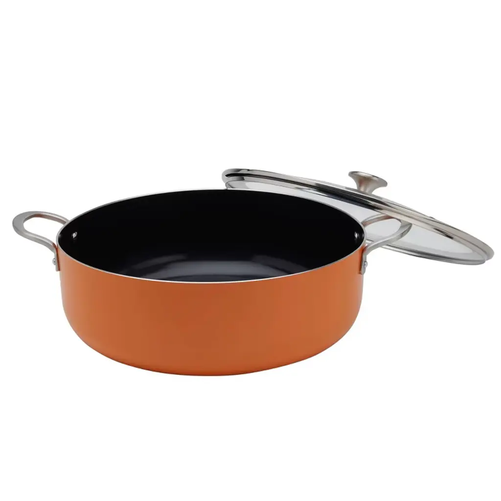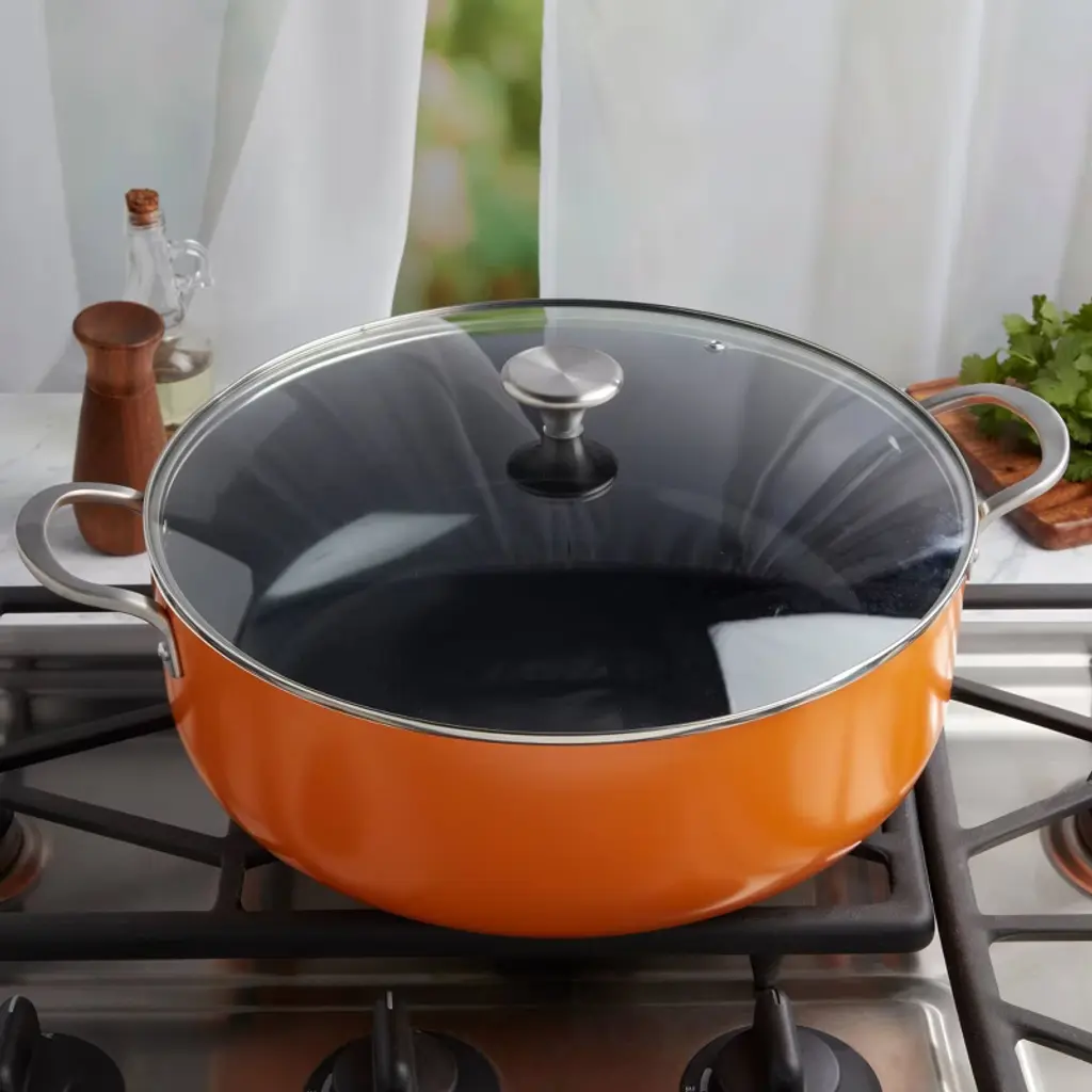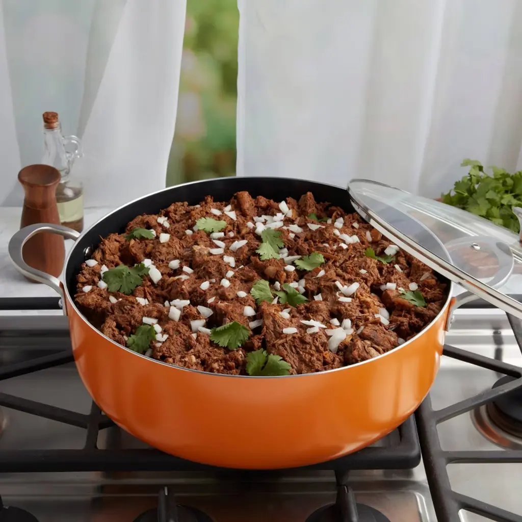INFUSE brings the intense flavors of Latin cuisine to your kitchen with a cookware collection that celebrates the cultural significance of Latin cooking. Our assortment is designed to honor the rich history of the cuisine and bring out the delightful aromas and delicious flavors that have made the food so popular worldwide. Whether you’re cooking rice, braising meat, or simmering a stew, grab a reliable caldero and enjoy an authentic and deliciously prepared meal. This caldero, from the Spanish ‘cauldron,’ features rounded sides that are built to handle a wide variety of recipes, similar to a saute pan. This beautiful 6-quart yellow caldero is dependable and versatile, made of durable aluminum that heats up quickly and evenly, and finished with a premium non-stick coating for excellent food release and easy cleanup.