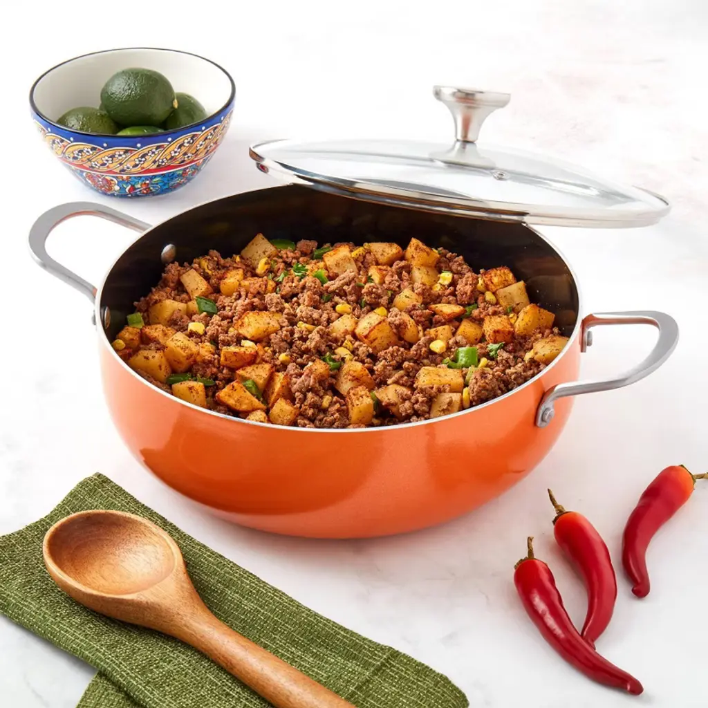 INFUSE brings the intense flavors of Latin cuisine to your kitchen with a cookware collection that celebrates the cultural significance of Latin cooking. Our assortment is designed to honor the rich history of the cuisine and bring out the delightful aromas and delicious flavors that have made the food so popular worldwide. Whether you’re cooking rice, braising meat, or simmering a stew, grab a reliable caldero and enjoy an authentic and deliciously prepared meal. This caldero, from the Spanish ‘cauldron,’ features rounded sides that are built to handle a wide variety of recipes, similar to a saute pan. This beautiful 6-quart yellow caldero is dependable and versatile, made of durable aluminum that heats up quickly and evenly, and finished with a premium non-stick coating for excellent food release and easy cleanup.