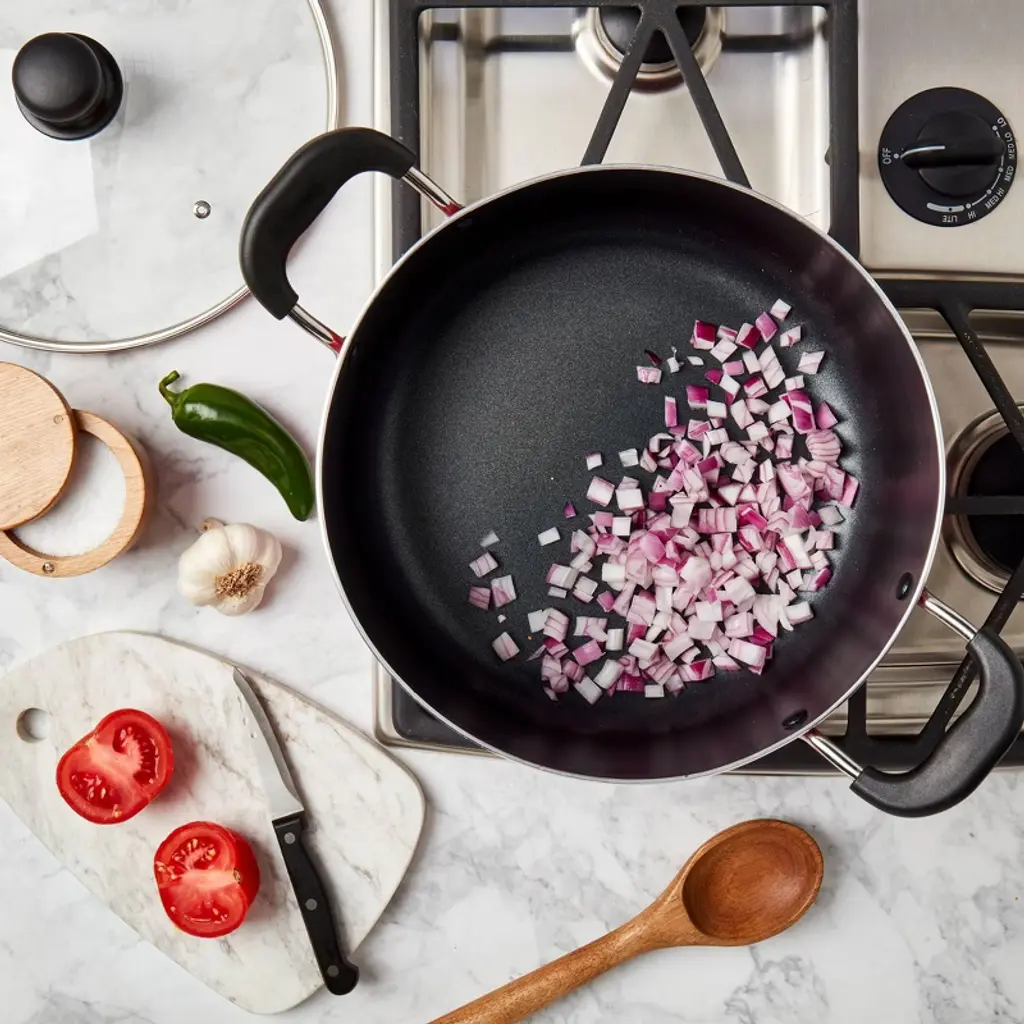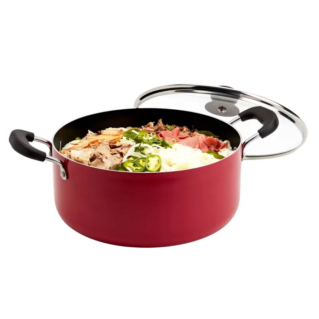 INFUSE captures the spirit of Asian cuisine, a rich 2000-year tradition of hospitality, harmony, and love of food. To bring this cherished cuisine, its time-honored techniques, and exquisite flavors into your home, we have created a brand of authentic Asian cookware- INFUSE. We invite you to delight all your senses with the many wonders of Asian cuisine. Whether you're boiling water, cooking rice, braising meat, or simmering a stew, this stock pot will help you achieve authentic and deliciously prepared meals. This dependable and versatile family cooker, made of aluminum, provides a large surface for your cooking needs, with convenient quick heating and superior heat distribution. The nonstick surface requires significantly less oil or butter, promoting healthier meal preparation and preventing food from sticking, providing hassle-free maintenance. The double riveted handles are designed to stay cool to the touch for a secure hold, ensuring balance and stability for easy maneuvering. Prep, cook, and serve mouth-watering meals for the whole family with this 8-quart cooker from INFUSE. This stylish red or black aluminum cooker is perfect for a variety of meals and big-batch recipes!