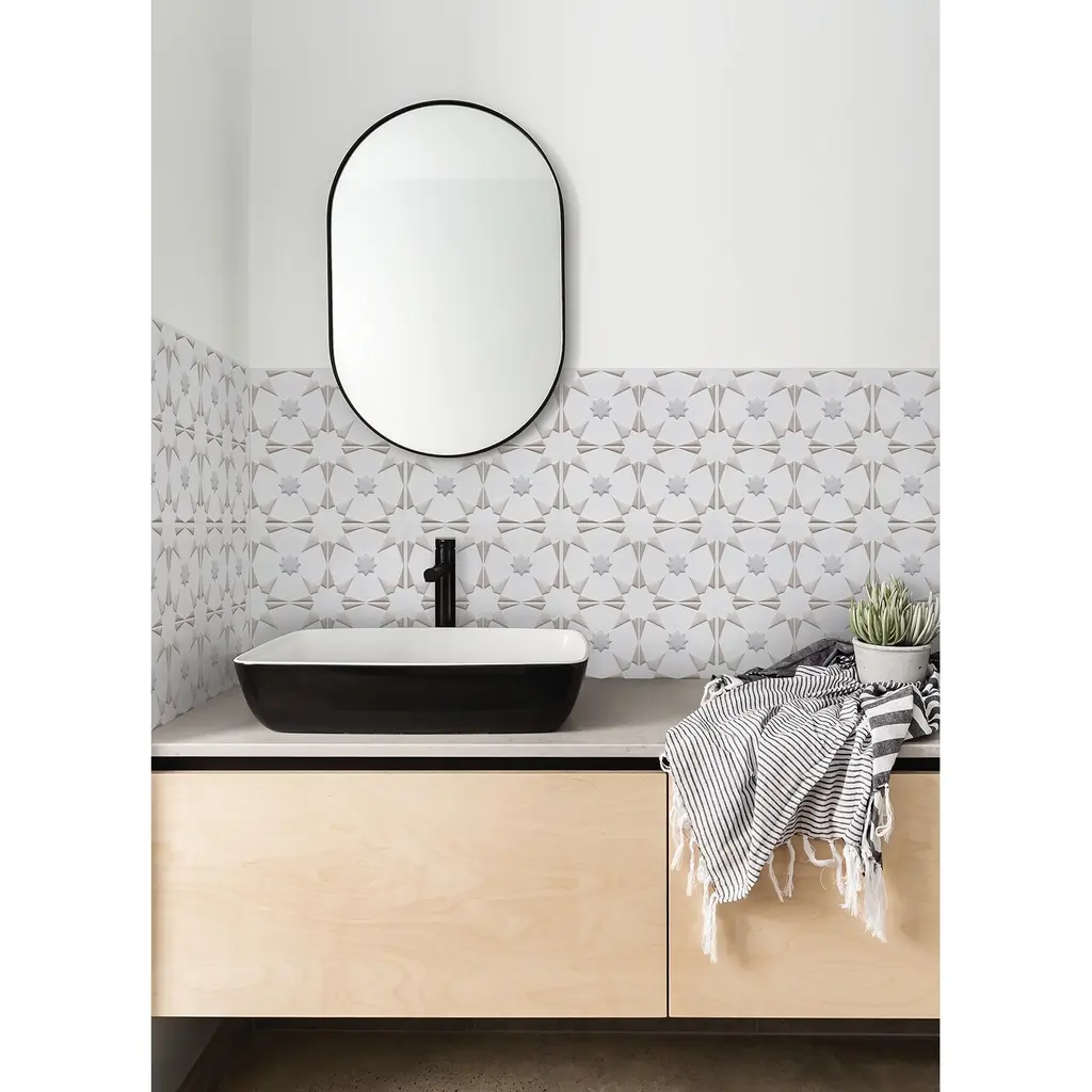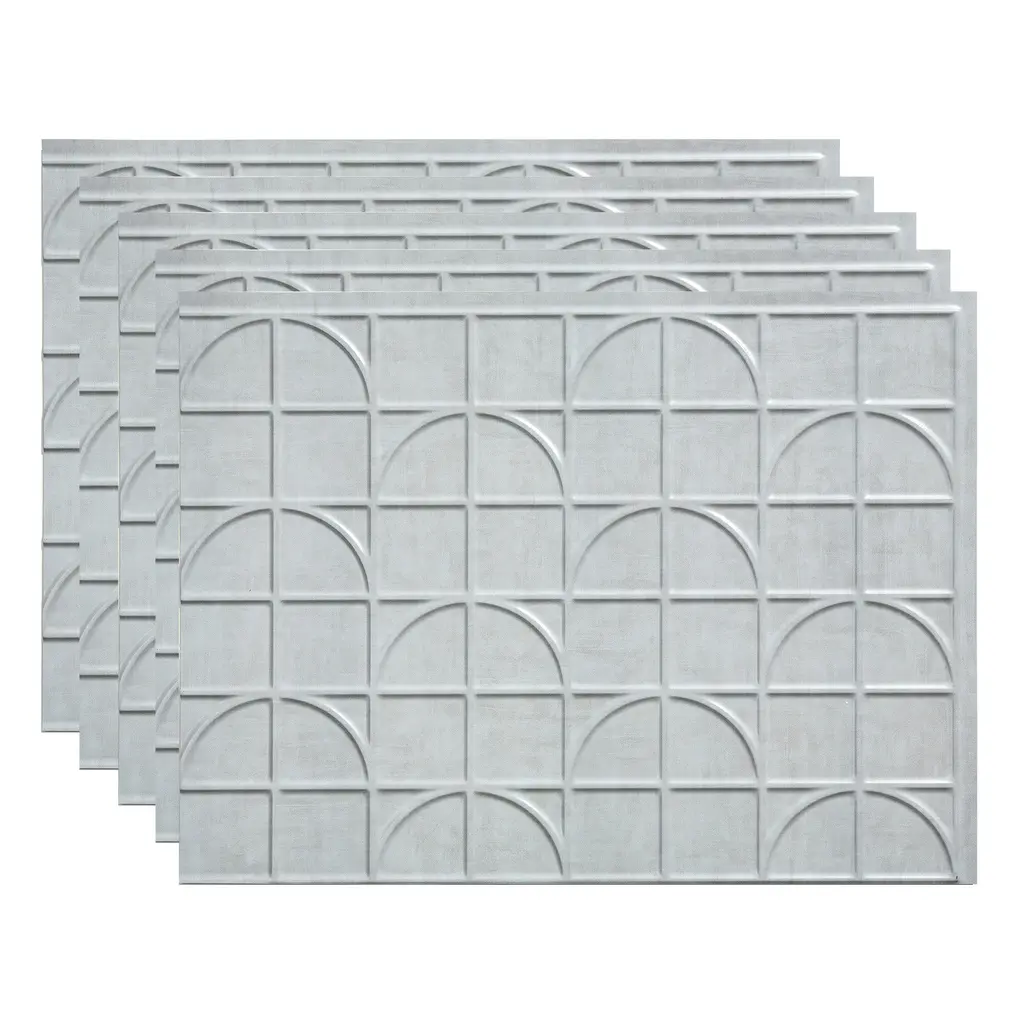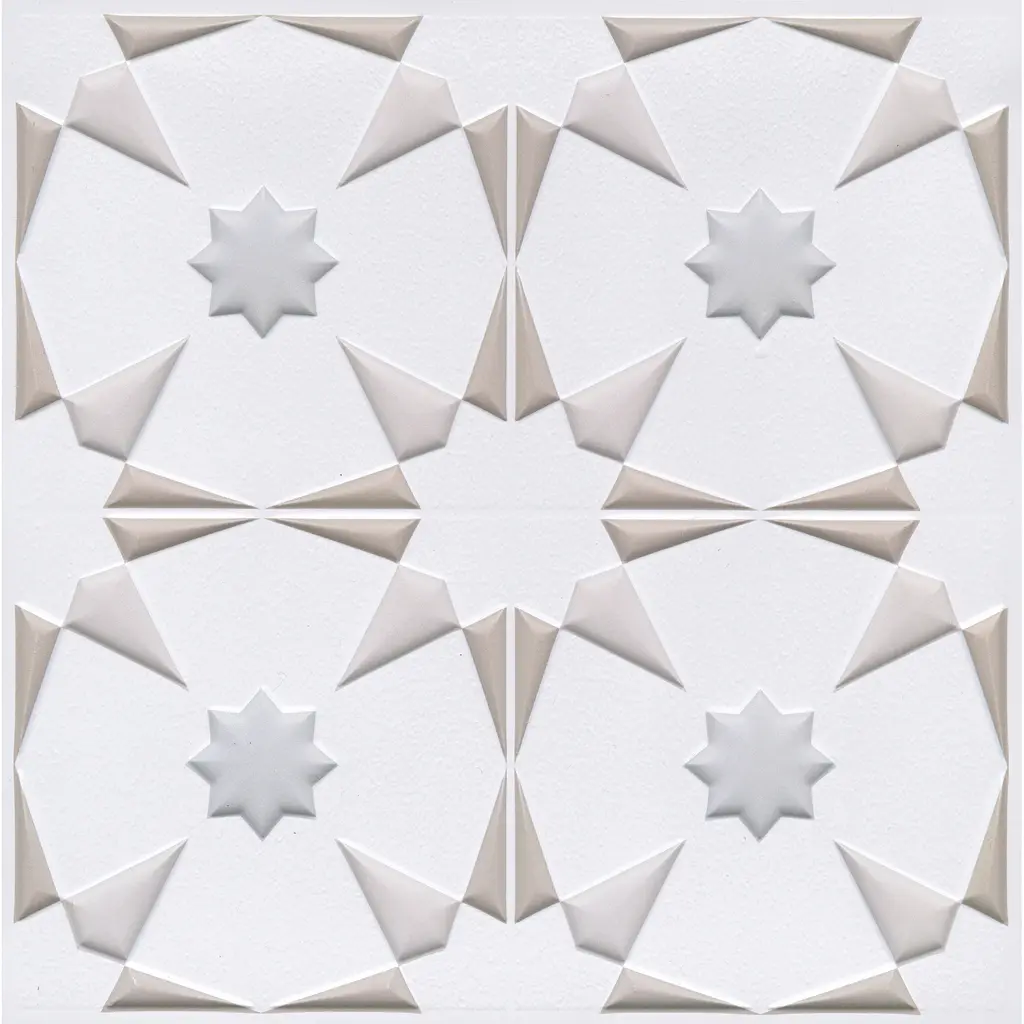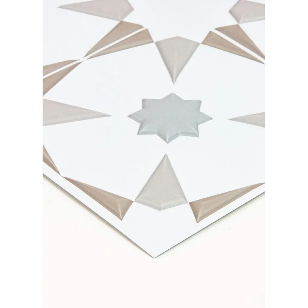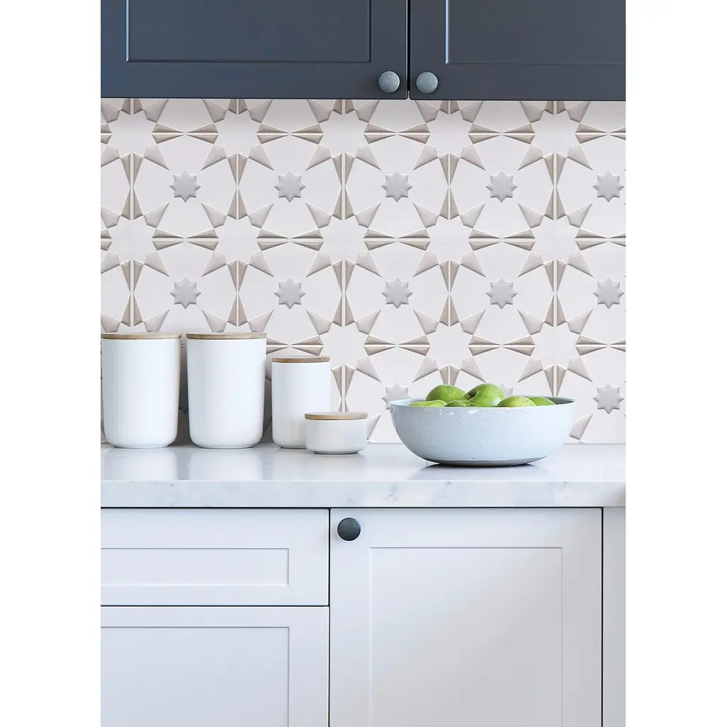 Add farmhouse flair to kitchens and bathrooms with this quilted star design. This slate, white, and grey geometric peel and stick backsplash will brighten up any walls. Vega Peel & Stick Embossed Tile Backsplash contains 4 pieces on 4 sheets that each measure 10-in wide by 10-in long. This product measures 20-in wide by 20-in long when assembled. Grey and white peel and stick backsplash tile with a center star design; Peel and stick tile panels with a high shine finish; A stove without a backing needs 15 in (38 cm) of space or more above range to avoid exposure of product to heat; Wipe clean with a damp cloth; Easily repositionable while installing; Each pack contains 4 tiles. Individual tiles measure 10-in by 10-in;Covers about 2.7 square feet when assembled.