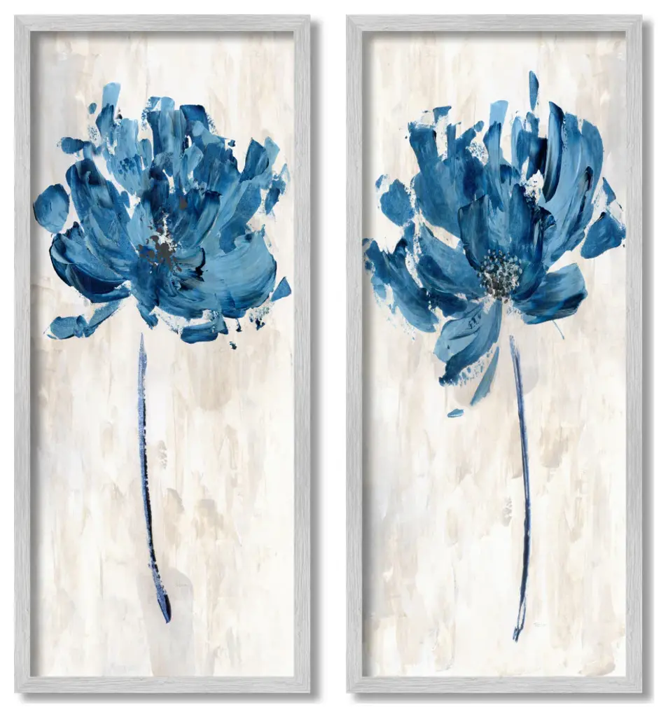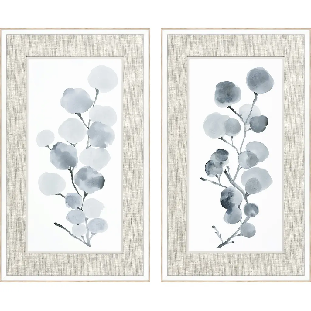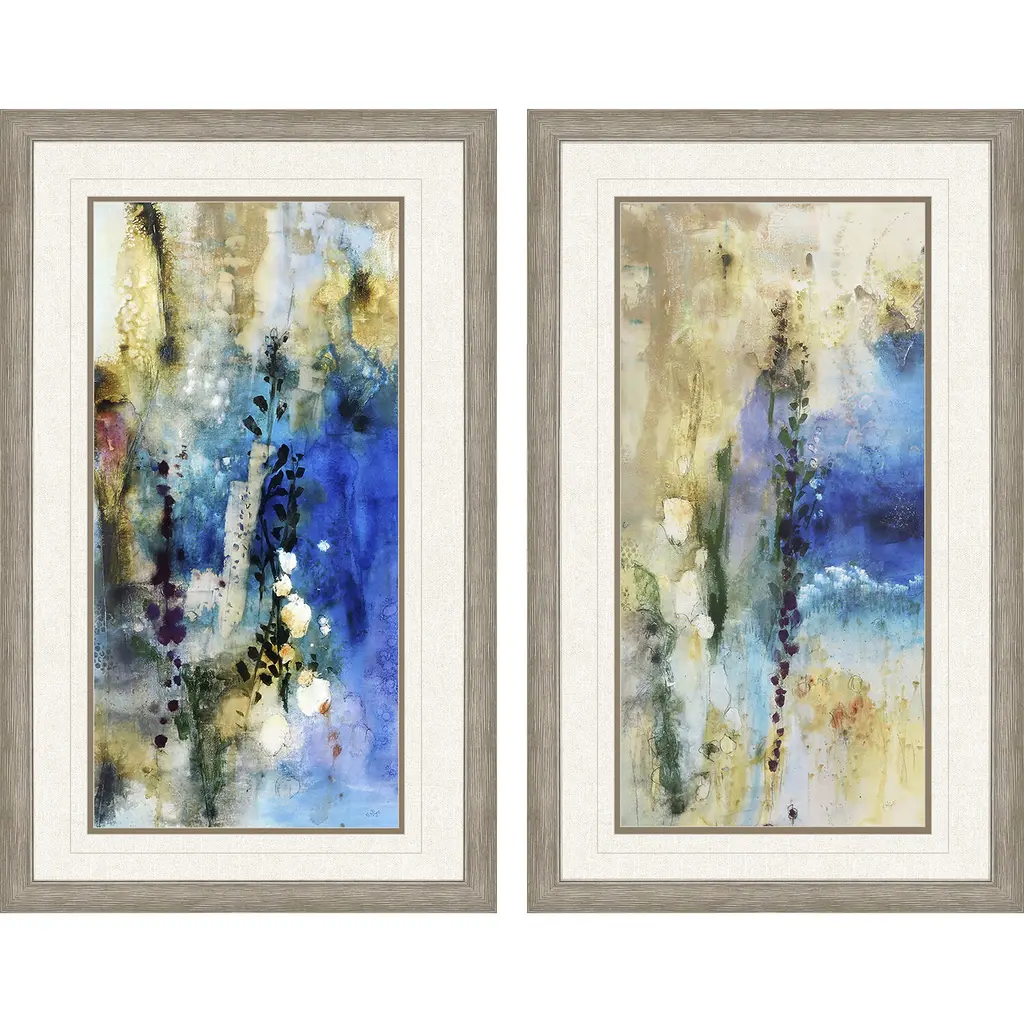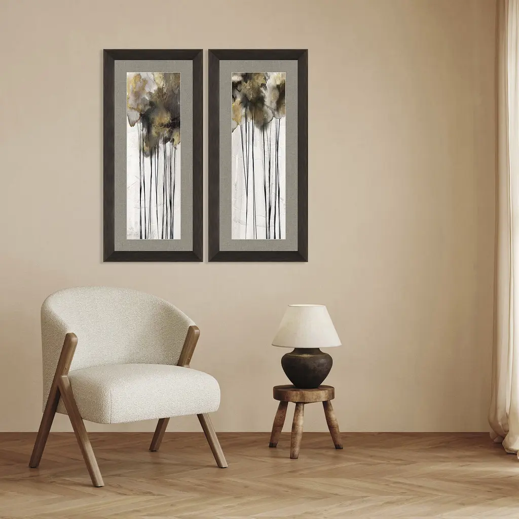 Tall trees are topped with a dark cluster of colors. Featuring premium matting and framed in an angled profile moulding with a dark wood finish.