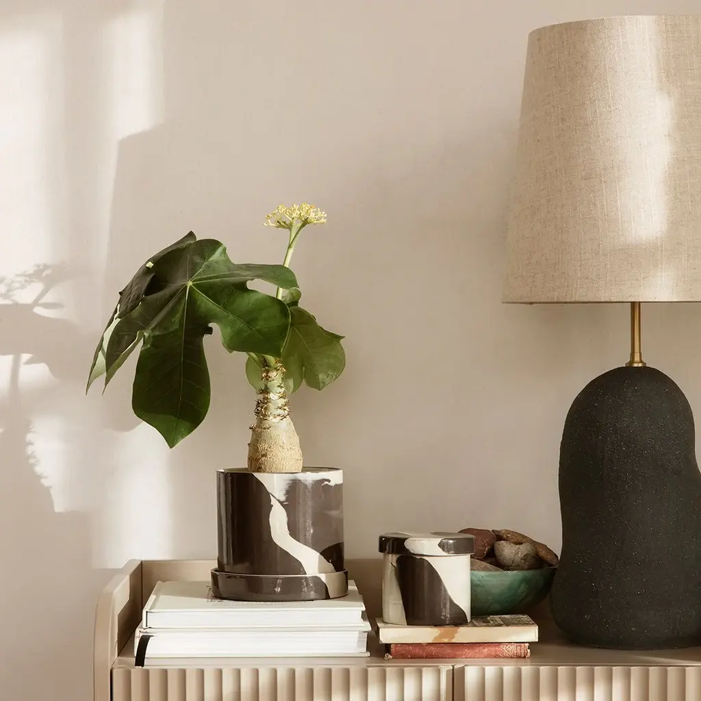 The Inlay series is a collection of stoneware that features a distinctive, two-tone mix of clays that create a large-scale, marble-like pattern – each of which is unique to the individual piece. A clear, high-gloss glazing ensures a smooth finish. This all-purpose container can be used for everything from storing dry goods in the kitchen to stationary in your home office.