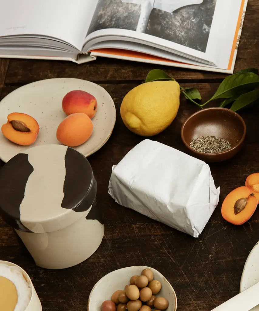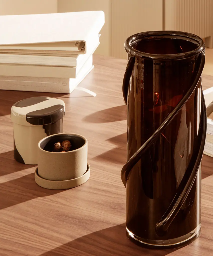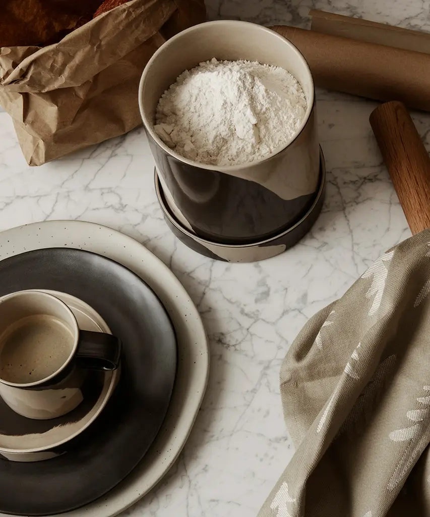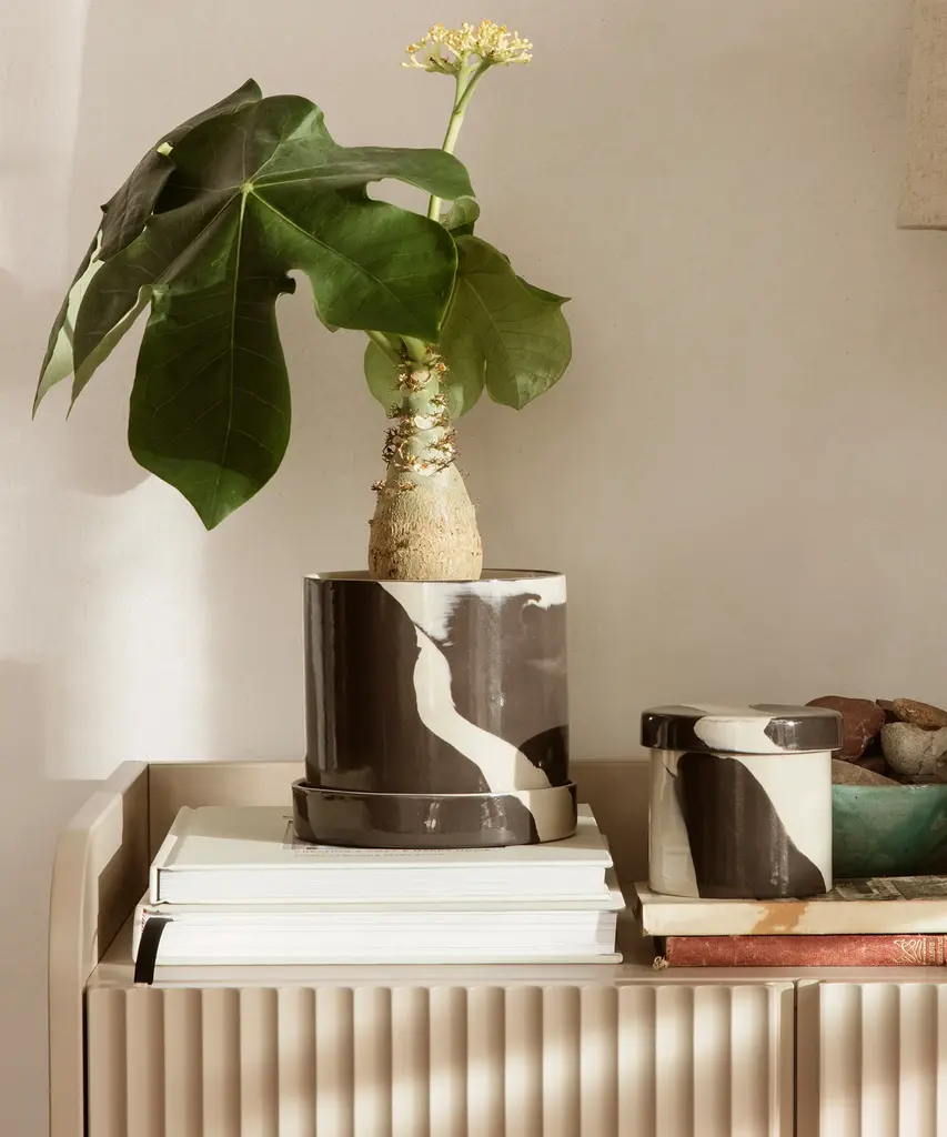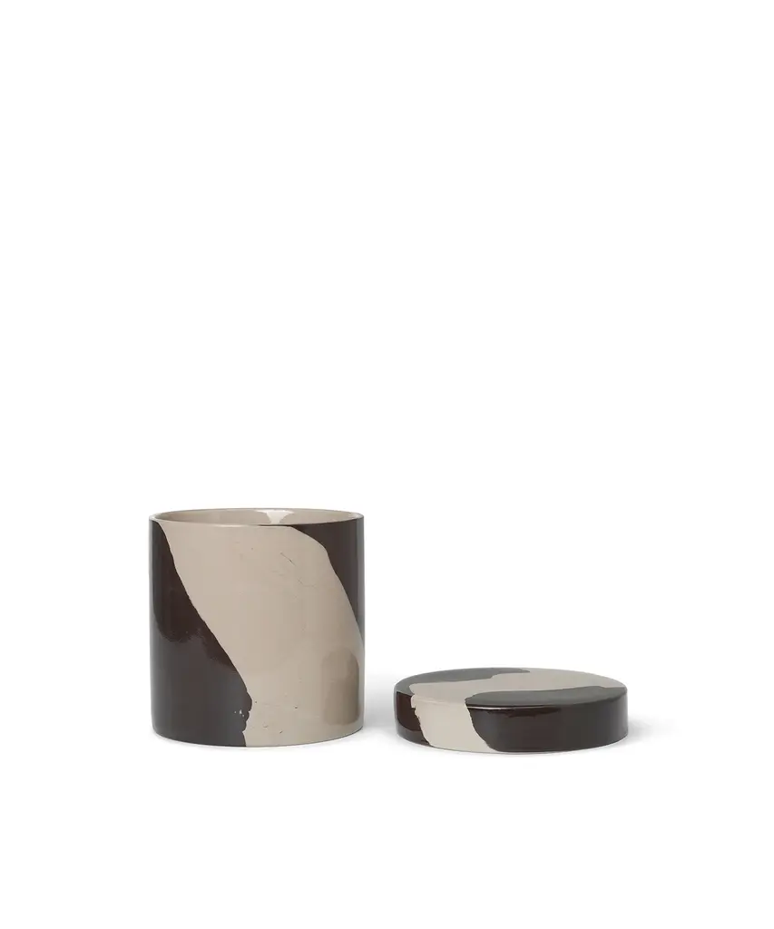 The Inlay series is a collection of stoneware that features a distinctive, two-tone mix of clays that create a large-scale, marble-like pattern – each of which is unique to the individual piece. A clear, high-gloss glazing ensures a smooth finish. This all-purpose container can be used for everything from storing dry goods in the kitchen to stationary in your home office. Produced by the Copenhagen-based studio Ferm Living.