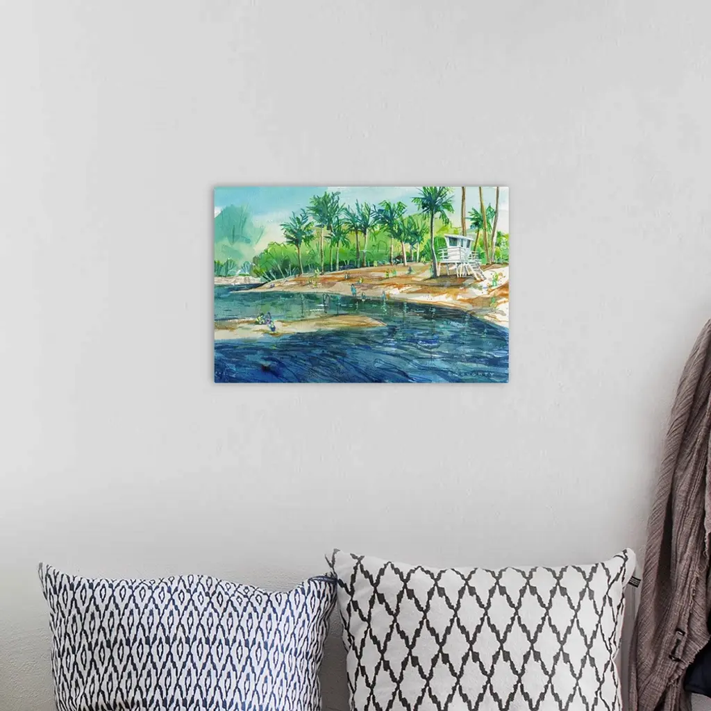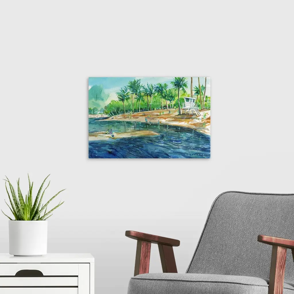 The artist used to play here in Dubois Park as a child, and came back for a visit a few decades later. She sat by a bridge and captured the clear water with todayos children playing in the shallows of the Loxahatchee River just off the Atlantic Ocean. The original illustration was created with watercolor, acrylic, and markers.