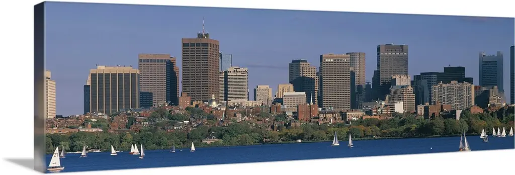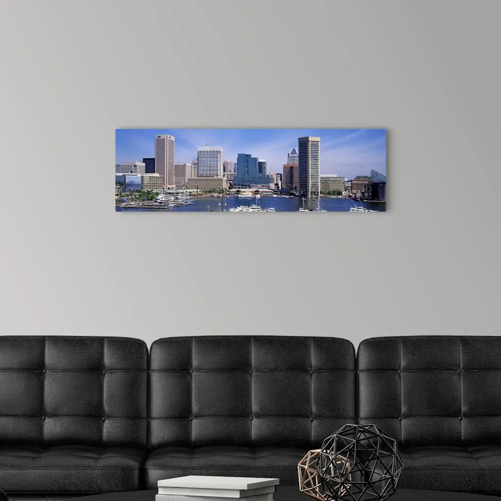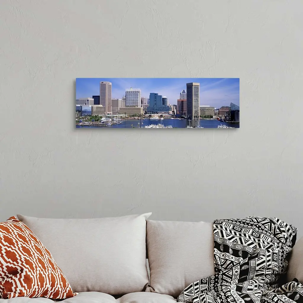 Panoramic image of the harbor area of downtown Baltimore, Maryland with sailboats and yachts parked in the marina.