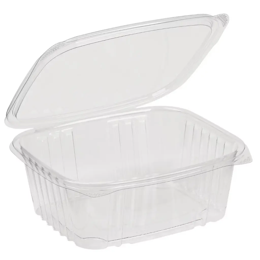 This 24 oz. hinged food container is constructed from up to 50% post-consumer recycled PET plastic. Designed for both hot and cold foods, it features a tight-sealing, leak-proof lid, eliminating the need for separate lids. The container is stackable, crack-resistant, and offers excellent clarity for product visibility. Lightweight and durable, it is ideal for delivery, takeout, and general food storage, including refrigeration and freezing. Recyclable when clean and dry, this PFAS-free container provides an eco-conscious solution without compromising performance.