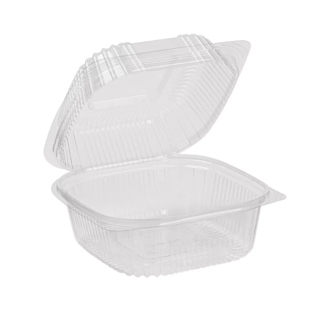 These 6" x 6" x 3" clear RPET clamshell containers are a durable and eco-conscious solution for hot or cold food. Constructed from up to 50% post-consumer recycled material, these stackable and leak-proof containers feature a tight-sealing, hinged lid, eliminating the need for separate lids. They offer excellent clarity, crack resistance, and are lightweight, making them ideal for delivery, takeout, or general food storage. Suitable for refrigeration and freezing, these containers are also recyclable when clean and dry and contain no added PFAS.