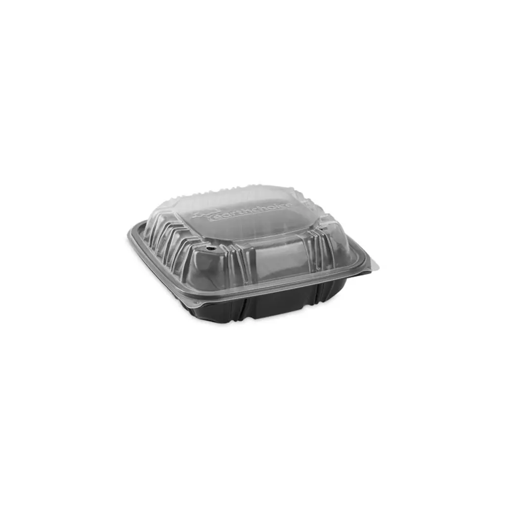 This 8 oz. recycled PET hinged container is a durable and clear solution for takeout and food storage. Constructed from up to 50% post-consumer recycled material, this eco-friendly container features a tight-sealing, leak-proof lid and stackable design. Suitable for both hot and cold foods, it can be refrigerated and frozen. Its crack-resistant and lightweight construction, combined with excellent clarity, makes it ideal for delivery, takeout, and to-go applications. Recyclable when clean and dry, this container offers a sustainable choice without compromising performance.