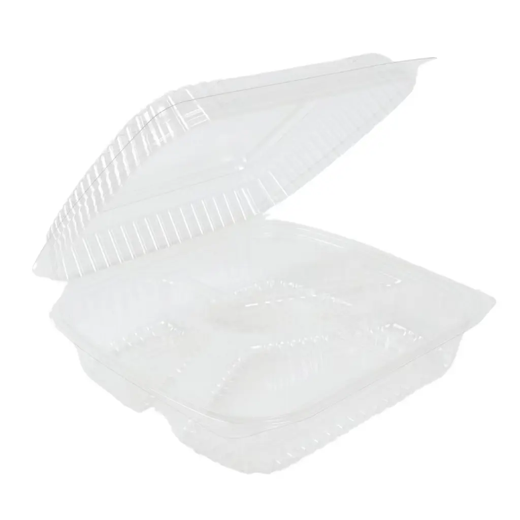 The 9" x 9" x 3" RPET Clear 3-Compartment Clamshell is a durable and clear disposable food container made from up to 50% post-consumer recycled PET plastic. Ideal for hot or cold food, these stackable and leak-proof clamshells feature a tight-sealing, hinged lid, eliminating the need for separate lids. They are crack-resistant, lightweight, and offer excellent clarity, making them suitable for delivery, takeout, or to-go applications. These containers can be refrigerated and frozen, contain no added PFAS, and are recyclable when clean and dry.