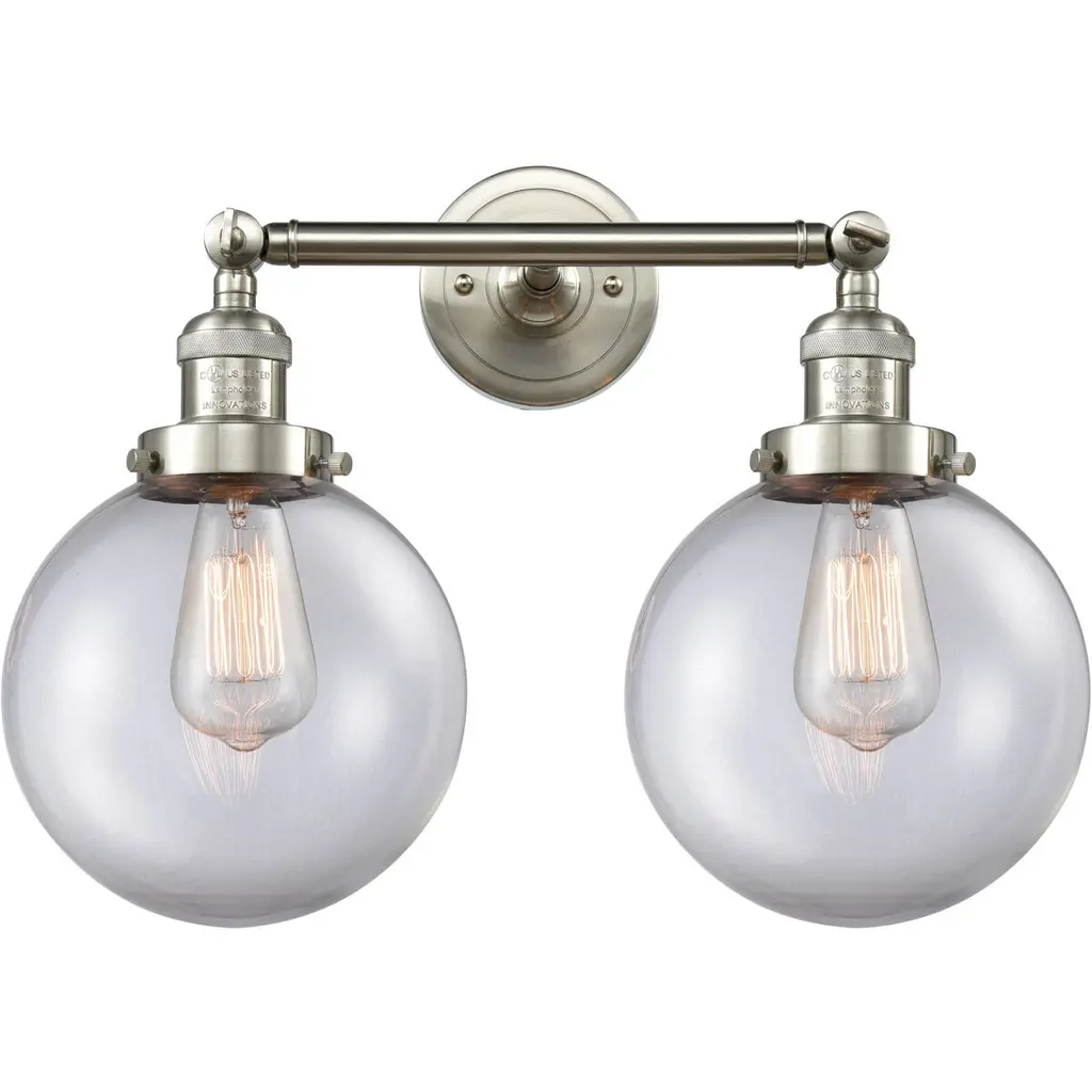 INNOVATIONS LIGHTING 208-BAB-G202-8-LED Large Beacon 2 Light Bath Vanity Light part of the Franklin Restoration Collection. The Large Beacon 2 Light Bath Vanity Light is part of the Franklin Restoration Collection. Collection: Franklin Restoration. Material: Steel, Cast Brass, Glass. Metal Finish(Body): Black Antique Brass. Metal Finish(Canopy/Backplate): Black Antique Brass. Dimension(in): 19(W) x 14(H) x 9(Ext). Bulb: (2)3.5 Watt LED Vintage Medium Base Bulb Included,Dimmable. Color Temperature: 2700. Color Rendering Index(CRI): 82. Lumens): 350. Voltage: 120. Glass: Clear Beacon/Transparent. Shade Shape: Globe. Shade Material: Glass. Shade Size(in): 8 X 7.75. Shade Fitter Measurement: 3.25 inch Fitter. Canopy Dimension(in): 4.5. Backplate Dimension(in): 4.5x0.75. Fixture can be hung with bulbs facing up or down as a Wall Mount. UL/CUL Damp Rated. Warranty: 2 Year Finish, Lifetime Electrical.