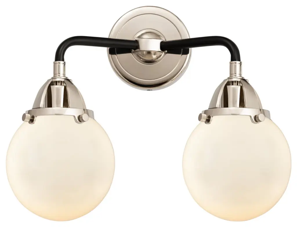 INNOVATIONS LIGHTING 208-BK-G201-8-LED Large Beacon 2 Light Bath Vanity Light part of the Franklin Restoration Collection. The Large Beacon 2 Light Bath Vanity Light is part of the Franklin Restoration Collection. Collection: Franklin Restoration. Material: Steel, Cast Brass, Glass. Metal Finish(Body): Matte Black. Metal Finish(Canopy/Backplate): Matte Black. Dimension(in): 19(W) x 14(H) x 9(Ext). Bulb: (2)3.5 Watt LED Vintage Medium Base Bulb Included,Dimmable. Color Temperature: 2700. Color Rendering Index(CRI): 82. Lumens): 350. Voltage: 120. Glass: Matte White Cased Beacon/Frosted. Shade Shape: Globe. Shade Material: Glass. Shade Size(in): 8 X 7.75. Shade Fitter Measurement: 3.25 inch Fitter. Canopy Dimension(in): 4.5. Backplate Dimension(in): 4.5x0.75. Fixture can be hung with bulbs facing up or down as a Wall Mount. UL/CUL Damp Rated. Warranty: 2 Year Finish, Lifetime Electrical.