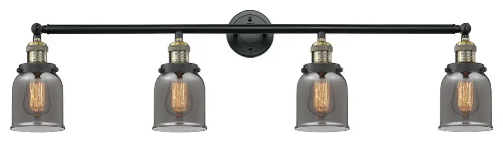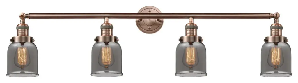 INNOVATIONS LIGHTING 215-AC-G53-LED 4 Light Vintage Dimmable LED Bathroom FixtureSmall Bell 4-Vintage Dimmable LED 42 inch Antique Copper Bathroom Fixture with Smoked glassCollection: Small BellMetal Finish: Antique CopperMaterial: Cast Brass, GlassGlass Color: Antique CopperGlass/Metal Shade Color: Plated SmokedGlass/Shade Description: Plated Smoked Small BellDimension(in): 42(W) x 9.75(H) x 7(Ext)Glass Shade Dimension(in): 5 X 5.75Shade Fitter Size: 3.25 inch FitterCanopy Dimension(in): 4.5(Dia)Backplate Dimension(in): 4.5(Dia) x 0.75(Depth)Bulb: (4)3 Watt LED Vintage Medium Base Bulb IncludedMax Watts Per Socket: 100Color Temperature: 3000 KelvinLumens: 265CRI: 80UL Certification Type: Damp LocationETL Certification Type: Damp LocationReversible(can be hung with bulbs facing up or down): Yes