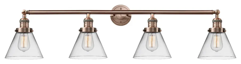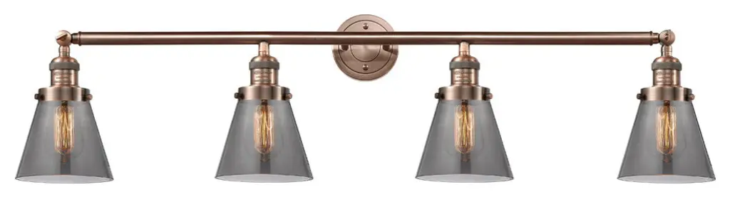 INNOVATIONS LIGHTING 215-AC-G63-LED 4 Light Vintage Dimmable LED Bathroom FixtureSmall Cone 4-Vintage Dimmable LED 42.25 inch Antique Copper Bathroom Fixture with Smoked glassCollection: Small ConeMetal Finish: Antique CopperMaterial: Cast Brass, GlassGlass Color: Antique CopperGlass/Metal Shade Color: SmokedGlass/Shade Description: Smoked Small ConeDimension(in): 42.25(W) x 9.75(H) x 7.625(Ext)Glass Shade Dimension(in): 6.25 X 5.75Shade Fitter Size: 3.25 inch FitterCanopy Dimension(in): 4.5(Dia)Backplate Dimension(in): 4.5(Dia) x 0.75(Depth)Bulb: (4)3 Watt LED Vintage Medium Base Bulb IncludedMax Watts Per Socket: 100Color Temperature: 3000 KelvinLumens: 265CRI: 80UL Certification Type: Damp LocationETL Certification Type: Damp LocationReversible(can be hung with bulbs facing up or down): Yes