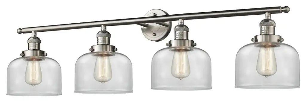 INNOVATIONS LIGHTING 215-PC-G52-LED 4 Light Vintage Dimmable LED Bathroom FixtureSmall Bell 4-Vintage Dimmable LED 42 inch Polished Chrome Bathroom Fixture with Clear glassCollection: Small BellMetal Finish: Polished ChromeMaterial: Cast Brass, GlassGlass Color: Polished ChromeGlass/Metal Shade Color: ClearGlass/Shade Description: Clear Small BellDimension(in): 42(W) x 9.75(H) x 7(Ext)Glass Shade Dimension(in): 5 X 5.75Shade Fitter Size: 3.25 inch FitterCanopy Dimension(in): 4.5(Dia)Backplate Dimension(in): 4.5(Dia) x 0.75(Depth)Bulb: (4)3 Watt LED Vintage Medium Base Bulb IncludedMax Watts Per Socket: 100Color Temperature: 3000 KelvinLumens: 265CRI: 80UL Certification Type: Damp LocationETL Certification Type: Damp LocationReversible(can be hung with bulbs facing up or down): Yes