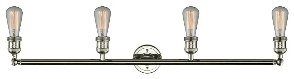 INNOVATIONS LIGHTING 215-PN-LED Bare Bulb 4 Light Bath Vanity Light. The Bare Bulb 4 Light Bath Vanity Light is part of the Franklin Restoration Collection. Collection: Franklin Restoration. Material: Steel, Cast Brass. Metal Finish(Body): Polished Nickel. Metal Finish (Canopy/Backplate): Polished Nickel. Dimension(in): 4(H) x 42(W) x 6.125(Ext). Maximum Wattage Per Socket: 100. Bulb: (4)3.5 Watt LED Vintage Medium Base Bulb Included. Dimmable: Yes. Color Temperature(Kelvin): 2700. Lumens: 350. Color Rendering Index(CRI): 82. Voltage: 120. Canopy Dimensions(in): 4.5. Backplate Dimensions(in): 4.5x0.75. Certification: UL & ETL, Damp Location.