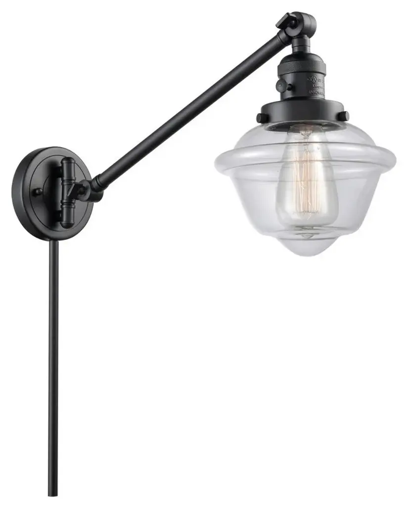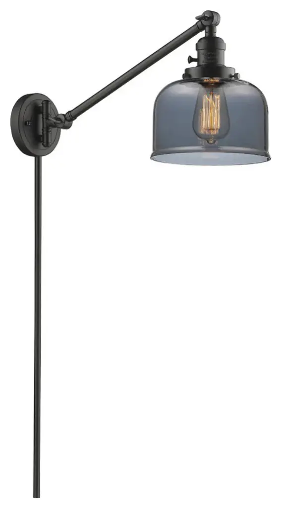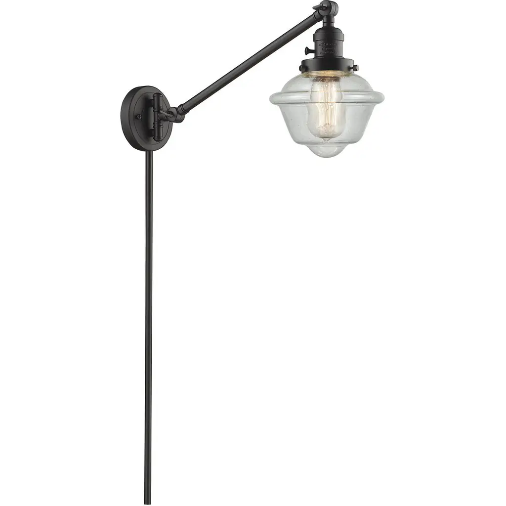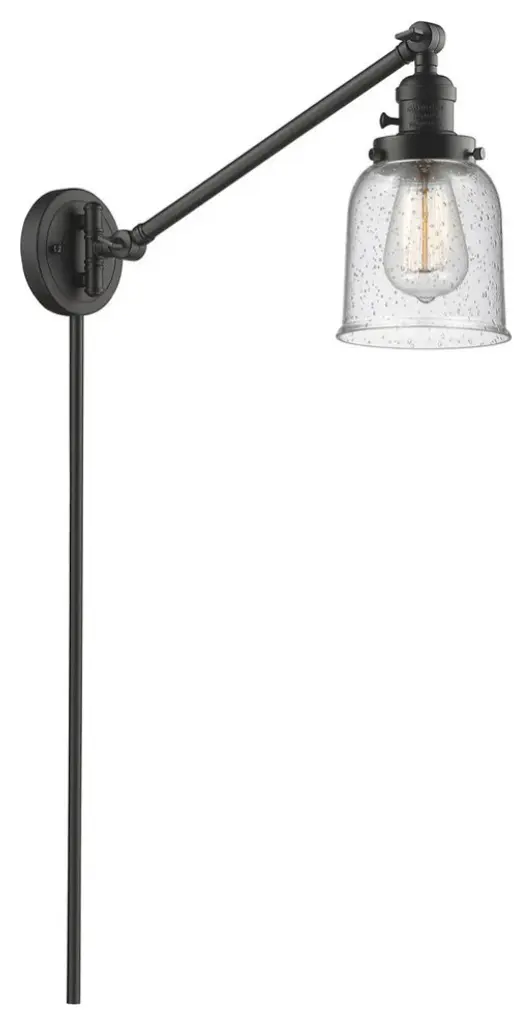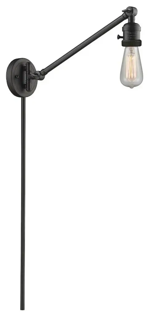 INNOVATIONS LIGHTING 237-OB-M5-LED Railroad 1 Light Swing Arm. The Railroad 1 Light Swing Arm is part of the Franklin Restoration Collection.3 Way (High-Low-Off) Switch Included on Socket. Family Name: Railroad. Collection Name: Franklin Restoration. Metal Finish(Body): Oil Rubbed Bronze. Metal Finish(Shade): Oil Rubbed Bronze. Metal Finish (Canopy/Backplate): Oil Rubbed Bronze. Material: Steel, Cast Brass. Dimension(in): 25(H) x 8(W) x 21(Ext). Glass or Metal Shade Shape: Cone. Glass or Metal Shade Color: Oil Rubbed Bronze. Shade Material: Metal. Metal Shade Description: Oil Rubbed Bronze Railroad. Shade Size(Diameter x Height): 8 X 2. Shade Dimension(in): 8(Dia) x 2(H). Canopy Dimensions(in): 4.5. Backplate Dimensions(in): 4.5x0.75. Cord: Molded plug with 7 Feet Of Wire. Stem Specs: 2-12 inch solid tube cord covers. Bulb: (1)3.5W Medium Base LED(Included), Dimmable. Color Temperature: 2700. Lumens: 350. Color Rendering Index(CRI): 82. Life Expectancy(Hours): 15000. Switch Type : High-Low-Off. Voltage : 120. Warranty: 2 Year Finish, Lifetime Electrical. 3 Way (High-Low-Off) Switch Included on Socket. Fixture can be hung with bulbs facing up or down as a Wall Mount or Facing Down as a Ceiling Mount. Rated for 100 Watt Maximum. UL/CUL Damp Rated. In order to maintain the finish we recommend simply using water and a cheesecloth towel. Compatible with Incandescent, LED, Fluoresent and Halogen bulbs.