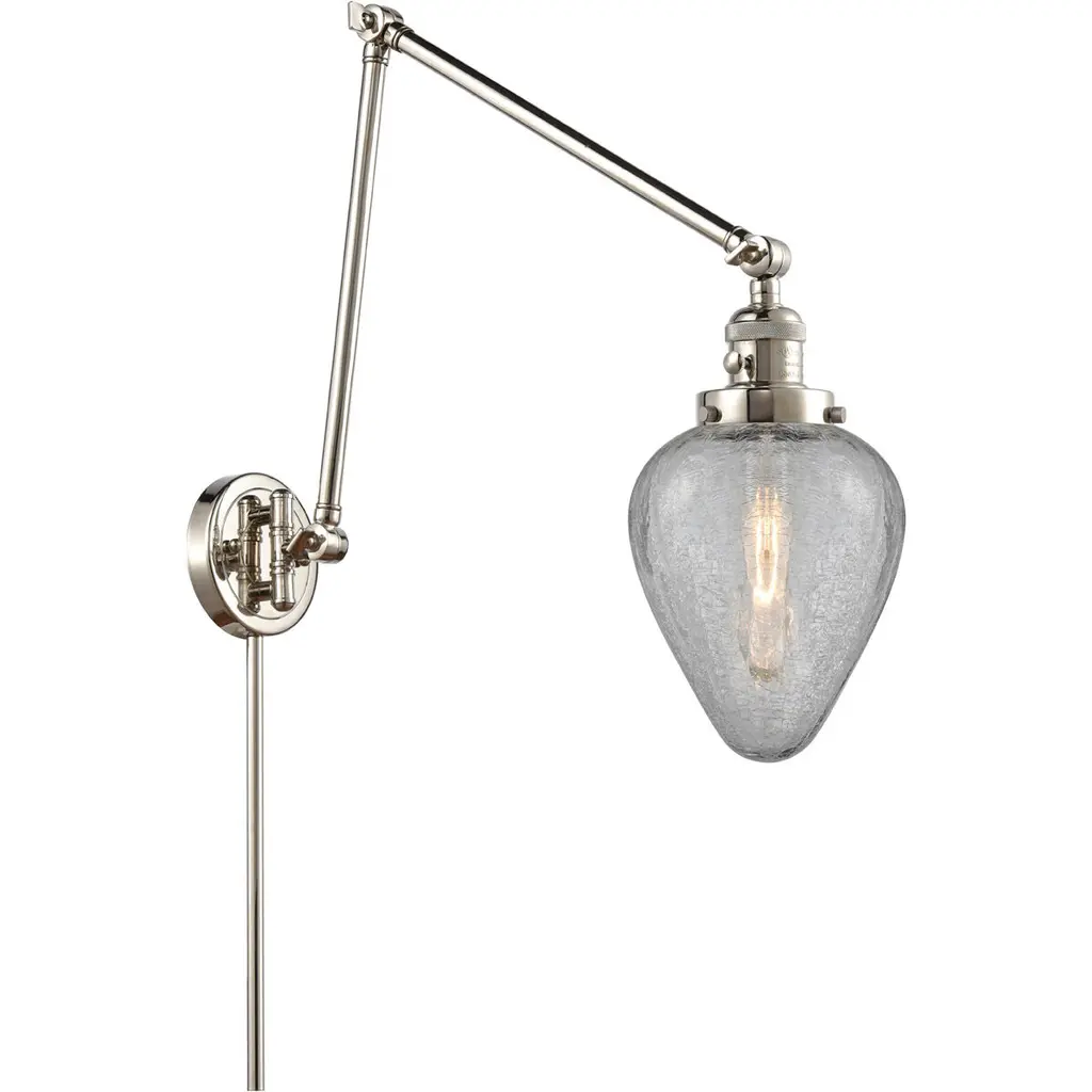 INNOVATIONS LIGHTING 237-SN-G165 Geneseo 1 Light Swing Arm part of the Franklin Restoration Collection. The Geneseo 1 Light Swing Arm is part of the Franklin Restoration Collection.3 Way (High-Low-Off) Switch Included on Socket. Collection: Franklin Restoration. Material: Steel, Cast Brass, Glass. Metal Finish(Body): Brushed Satin Nickel. Metal Finish(Canopy/Backplate): Brushed Satin Nickel. Dimension(in): 8(W) x 25(H) x 35(Ext). Wire/Cord: Molded plug with 7 Feet Of Wire. Bulb: (1)100 Medium Base Vintage Bulb recommended(Not Included). Voltage: 120. Switch Type: On/Off Turn Switch. Glass: Clear Crackle Geneseo/Crackled. Shade Shape: Teardrop. Shade Material: Glass. Shade Size(in): 6.5 X 8.75. Shade Fitter Measurement: 3.25 inch Fitter. Canopy Dimension(in): 4.5. Backplate Dimension(in): 4.5x0.75. Fixture can be hung with bulbs facing up or down as a Wall Mount or Facing Down as a Ceiling Mount. UL/CUL Damp Rated. Warranty: 2 Year Finish, Lifetime Electrical.