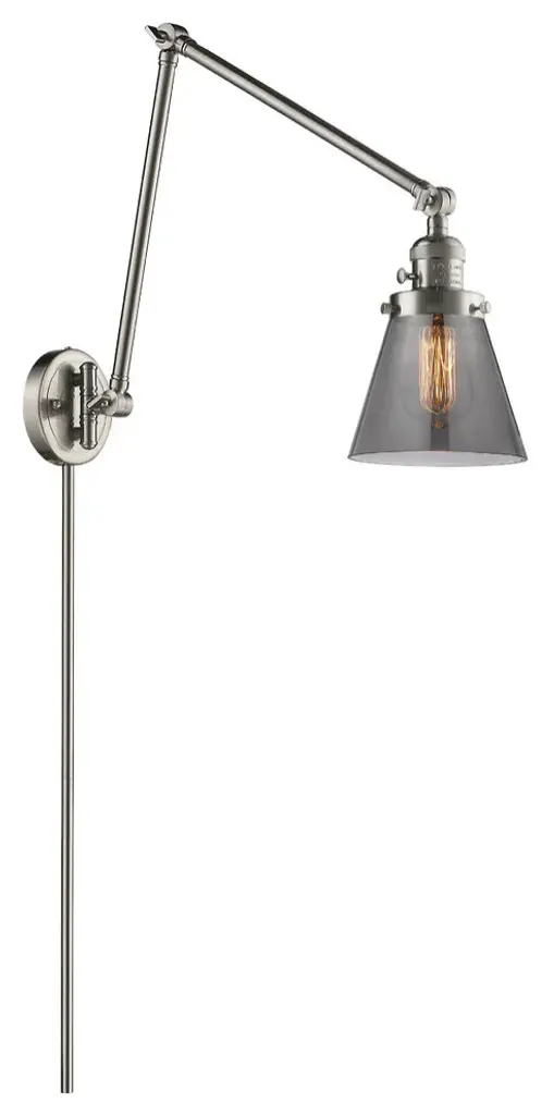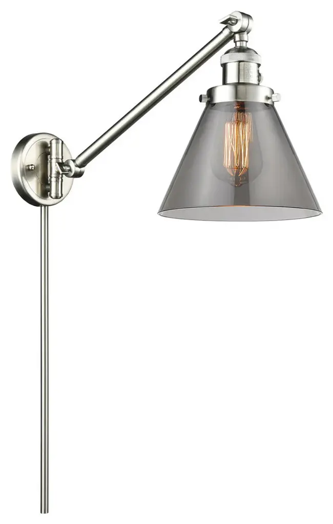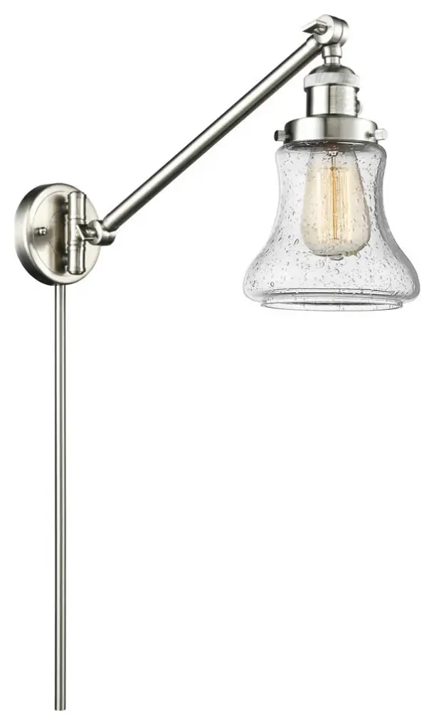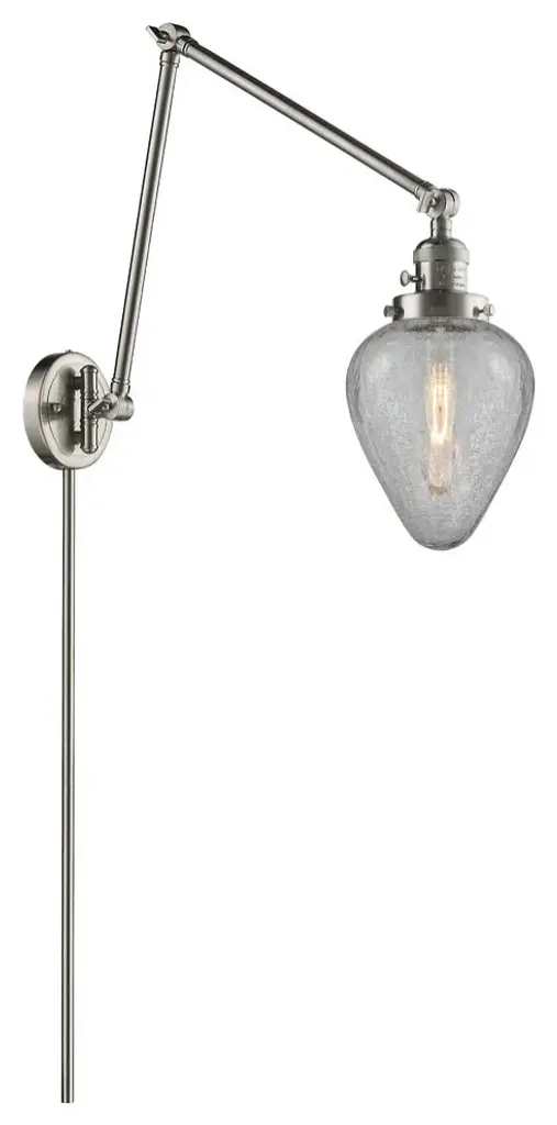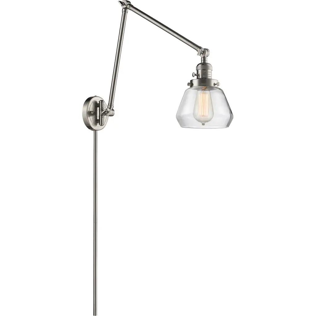INNOVATIONS LIGHTING 237-SN-G172-LED Fulton 1 Light Swing Arm. The Fulton 1 Light Swing Arm is part of the Franklin Restoration Collection.3 Way (High-Low-Off) Switch Included on Socket. Family Name: Fulton. Collection Name: Franklin Restoration. Metal Finish(Body): Brushed Satin Nickel. Metal Finish (Canopy/Backplate): Brushed Satin Nickel. Material: Steel, Cast Brass, Glass. Dimension(in): 25(H) x 8(W) x 35(Ext). Glass Shade Description: Clear Fulton. Glass Type: Transparent. Glass or Metal Shade Shape: Cone. Glass or Metal Shade Color: Clear. Shade Material: Glass. Shade Size(Diameter x Height): 6.75 X 5.25. Shade Dimension(in): 6.75(Dia) x 5.25(H). Canopy Dimensions(in): 4.5. Backplate Dimensions(in): 4.5x0.75. Cord: Molded plug with 7 Feet Of Wire. Stem Specs: 2-12 inch solid tube cord covers. Bulb: (1)3.5W Medium Base LED(Included), Dimmable. Color Temperature: 2700. Lumens: 350. Color Rendering Index(CRI): 82. Life Expectancy(Hours): 15000. Switch Type : High-Low-Off. Voltage : 120. Warranty: 2 Year Finish, Lifetime Electrical. 3 Way (High-Low-Off) Switch Included on Socket. Fixture can be hung with bulbs facing up or down as a Wall Mount or Facing Down as a Ceiling Mount. Rated for 100 Watt Maximum. UL/CUL Damp Rated. In order to maintain the finish we recommend simply using water and a cheesecloth towel. Compatible with Incandescent, LED, Fluoresent and Halogen bulbs.