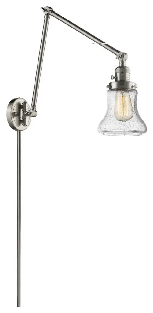 INNOVATIONS LIGHTING 237-SN-G184 Canton 1 Light Swing Arm part of the Franklin Restoration Collection. The Canton 1 Light Swing Arm is part of the Franklin Restoration Collection.3 Way (High-Low-Off) Switch Included on Socket. Collection: Franklin Restoration. Material: Steel, Cast Brass, Glass. Metal Finish(Body): Brushed Satin Nickel. Metal Finish(Canopy/Backplate): Brushed Satin Nickel. Dimension(in): 8(W) x 25(H) x 35(Ext). Wire/Cord: Molded plug with 7 Feet Of Wire. Bulb: (1)100 Medium Base Vintage Bulb recommended(Not Included). Voltage: 120. Switch Type: On/Off Turn Switch. Glass: Seedy Canton/Seeded. Shade Shape: Bell. Shade Material: Glass. Shade Size(in): 6 X 7.25. Shade Fitter Measurement: 3.25 inch Fitter. Canopy Dimension(in): 4.5. Backplate Dimension(in): 4.5x0.75. Fixture can be hung with bulbs facing up or down as a Wall Mount or Facing Down as a Ceiling Mount. UL/CUL Damp Rated. Warranty: 2 Year Finish, Lifetime Electrical.