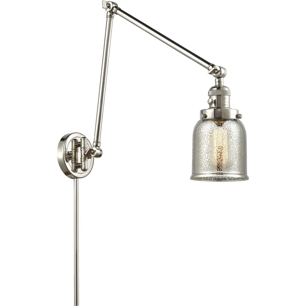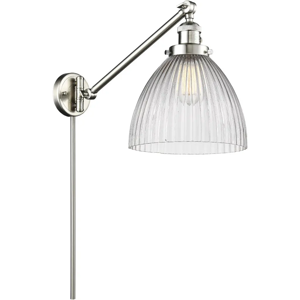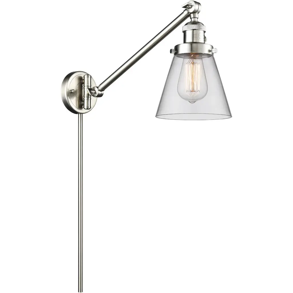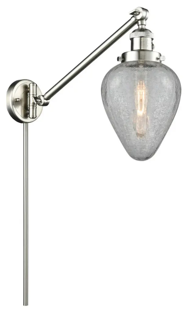 INNOVATIONS LIGHTING 237-SN-G2-LED Halophane 1 Light Swing Arm. The Halophane 1 Light Swing Arm is part of the Franklin Restoration Collection.3 Way (High-Low-Off) Switch Included on Socket. Family Name: Halophane. Collection Name: Franklin Restoration. Metal Finish(Body): Brushed Satin Nickel. Metal Finish (Canopy/Backplate): Brushed Satin Nickel. Material: Steel, Cast Brass, Glass. Dimension(in): 25(H) x 8.5(W) x 21(Ext). Glass Shade Description: Clear Halophane. Glass Type: Transparent. Glass or Metal Shade Shape: Cone. Glass or Metal Shade Color: Clear Halophane. Shade Material: Glass. Shade Size(Diameter x Height): 9 X 2. Shade Dimension(in): 9(Dia) x 2(H). Canopy Dimensions(in): 4.5. Backplate Dimensions(in): 4.5x0.75. Cord: Molded plug with 7 Feet Of Wire. Stem Specs: 2-12 inch solid tube cord covers. Bulb: (1)3.5W Medium Base LED(Included), Dimmable. Color Temperature: 2700. Lumens: 350. Color Rendering Index(CRI): 82. Life Expectancy(Hours): 15000. Switch Type : High-Low-Off. Voltage : 120. Warranty: 2 Year Finish, Lifetime Electrical. 3 Way (High-Low-Off) Switch Included on Socket. Fixture can be hung with bulbs facing up or down as a Wall Mount or Facing Down as a Ceiling Mount. Rated for 100 Watt Maximum. UL/CUL Damp Rated. In order to maintain the finish we recommend simply using water and a cheesecloth towel. Compatible with Incandescent, LED, Fluoresent and Halogen bulbs.