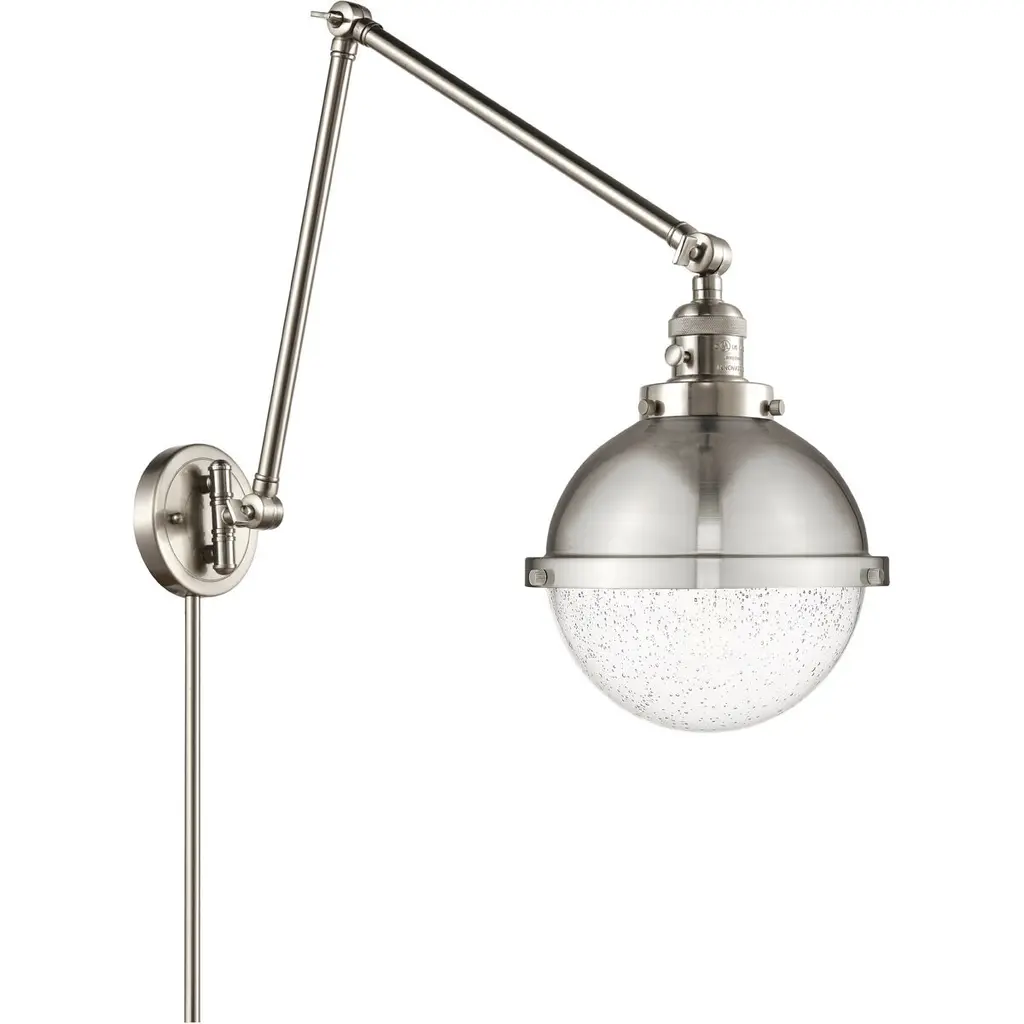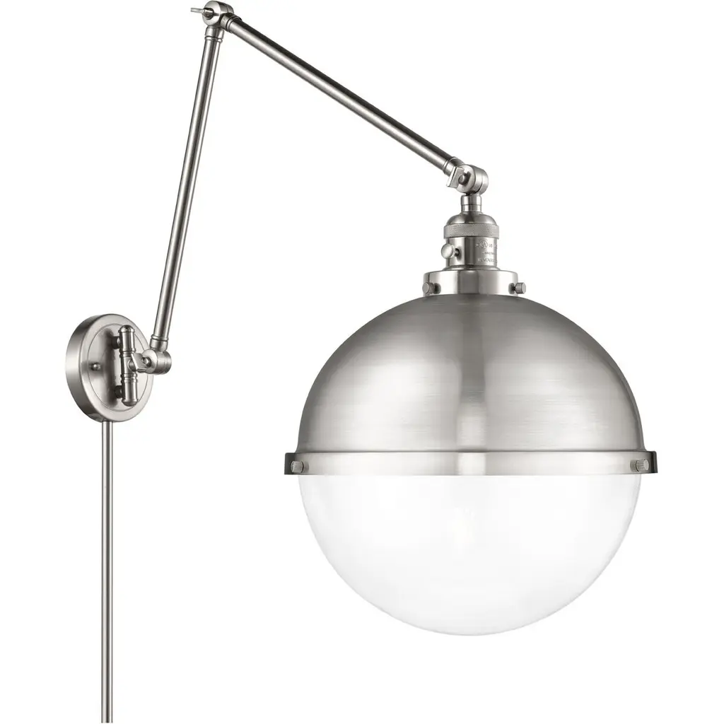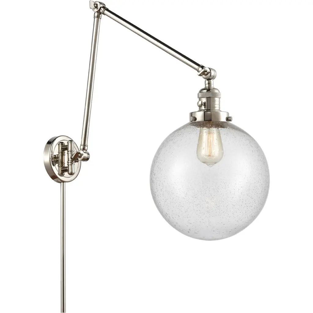 INNOVATIONS LIGHTING 237-SN-G201-8 Large Beacon 1 Light Swing Arm part of the Franklin Restoration Collection. The Large Beacon 1 Light Swing Arm is part of the Franklin Restoration Collection.3 Way (High-Low-Off) Switch Included on Socket. Collection: Franklin Restoration. Material: Steel, Cast Brass, Glass. Metal Finish(Body): Brushed Satin Nickel. Metal Finish(Canopy/Backplate): Brushed Satin Nickel. Dimension(in): 8(W) x 25(H) x 21(Ext). Wire/Cord: Molded plug with 7 Feet Of Wire. Bulb: (1)100 Medium Base Vintage Bulb recommended(Not Included). Voltage: 120. Switch Type: On/Off Turn Switch. Glass: Matte White Cased Beacon/Frosted. Shade Shape: Globe. Shade Material: Glass. Shade Size(in): 8 X 7.75. Shade Fitter Measurement: 3.25 inch Fitter. Canopy Dimension(in): 4.5. Backplate Dimension(in): 4.5x0.75. Fixture can be hung with bulbs facing up or down as a Wall Mount or Facing Down as a Ceiling Mount. UL/CUL Damp Rated. Warranty: 2 Year Finish, Lifetime Electrical.