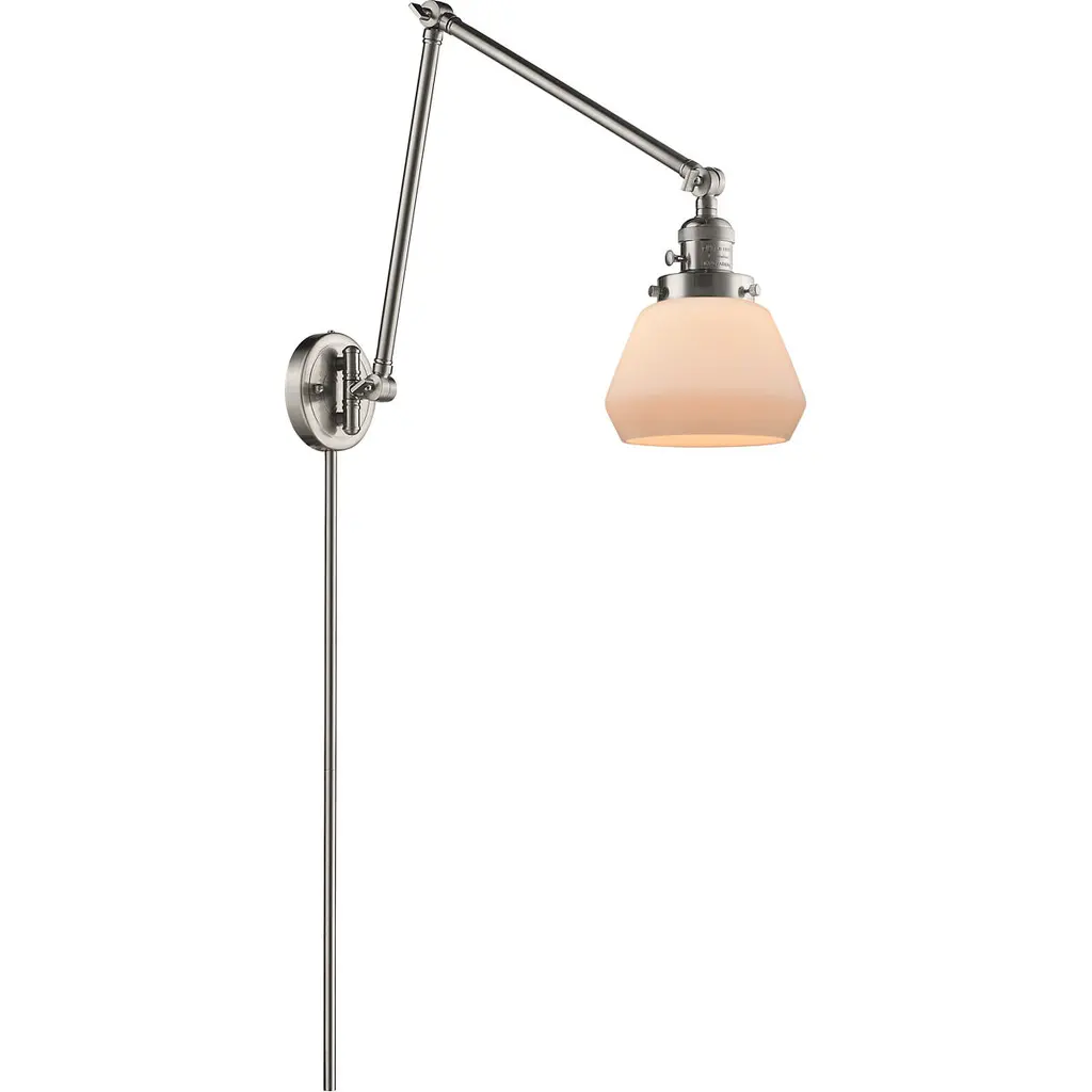 INNOVATIONS LIGHTING 237-SN-M10-LED 1 Light Vintage Dimmable LED Swing Arm. Briarcliff 1-30/70/100 watt 10 inch Brushed Satin Nickel Swing Arm with Brushed Satin Nickel Briarcliff shades and Solid Brass 180 Degree Adjustable Swivels. Collection: Briarcliff. Metal Finish: Brushed Satin Nickel. Material: Cast Brass. Glass/Metal Shade Color: Brushed Satin Nickel. Metal Shade Description: Brushed Satin Nickel Briarcliff. Dimension(in): 10(W) x 25(H) x 21(Ext). Cord/Wire: Plug. Glass Shade Dimension(in): 10 X 5.5. Shade Fitter Size: 3.25 inch Fitter. Canopy Dimension(in): 4.5(Dia). Backplate Dimension(in): 4.5(Dia) x 0.75(Depth). Bulb: (1)3 Watt LED Vintage Medium Base Bulb Included. Max Watts Per Socket: 100. Color Temperature: 3000 Kelvin. Lumens: 265. CRI: 80. UL Certification Type: Damp Location. ETL Certification Type: Damp Location. Reversible(can be hung with bulbs facing up or down): Yes.