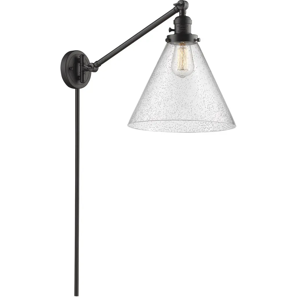 INNOVATIONS LIGHTING 238-OB-G44-LED Large Cone 1 Light Swing Arm. The Large Cone 1 Light Swing Arm is part of the Franklin Restoration Collection. Family Name: Large Cone. Collection Name: Franklin Restoration. Metal Finish(Body): Oil Rubbed Bronze. Metal Finish (Canopy/Backplate): Oil Rubbed Bronze. Material: Steel, Cast Brass, Glass. Dimension(in): 30(H) x 8(W) x 30(Ext). Glass Shade Description: Seedy Large Cone. Glass Type: Seeded. Glass or Metal Shade Shape: Cone. Glass or Metal Shade Color: Seedy. Shade Material: Glass. Shade Size(Diameter x Height): 7.75 X 6. Shade Dimension(in): 7.75(Dia) x 6(H). Canopy Dimensions(in): 4.5. Backplate Dimensions(in): 4.5x0.75. Cord: Molded plug with 7 Feet Of Wire. Stem Specs: 2-12 inch solid tube cord covers. Bulb: (1)3.5W Medium Base LED(Included), Dimmable. Color Temperature: 2700. Lumens: 350. Color Rendering Index(CRI): 82. Life Expectancy(Hours): 15000. Switch Type : High-Low-Off. Voltage : 120. Warranty: 2 Year Finish, Lifetime Electrical. Fixture can be hung with bulbs facing up or down as a Wall Mount or Facing Down as a Ceiling Mount. Rated for 100 Watt Maximum. UL/CUL Damp Rated. In order to maintain the finish we recommend simply using water and a cheesecloth towel. Compatible with Incandescent, LED, Fluoresent and Halogen bulbs.