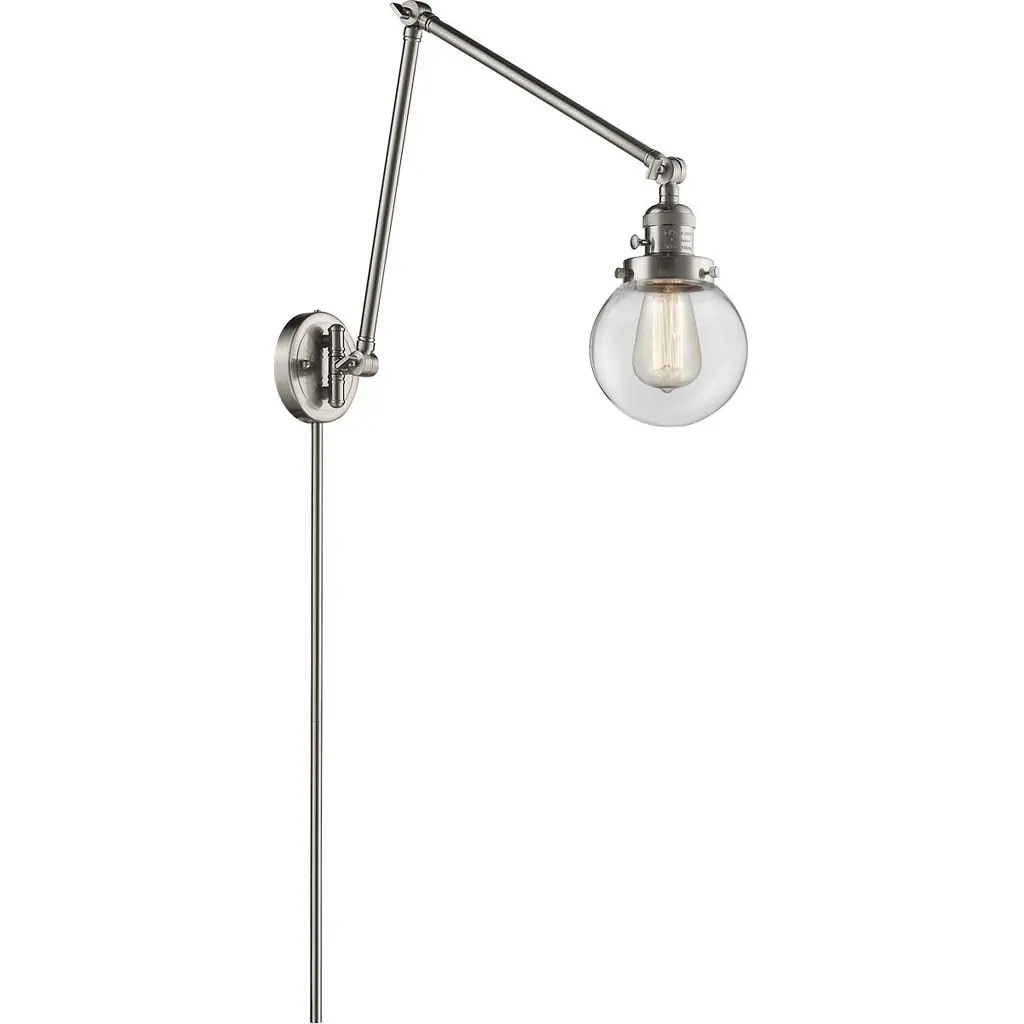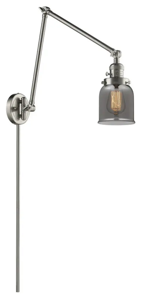 INNOVATIONS LIGHTING 238-SN-G52 Small Bell 1 Light Swing Arm part of the Franklin Restoration Collection. The Small Bell 1 Light Swing Arm is part of the Franklin Restoration Collection. Collection: Franklin Restoration. Material: Steel, Cast Brass, Glass. Metal Finish(Body): Brushed Satin Nickel. Metal Finish(Canopy/Backplate): Brushed Satin Nickel. Dimension(in): 8(W) x 30(H) x 30(Ext). Wire/Cord: Molded plug with 7 Feet Of Wire. Bulb: (1)100 Medium Base Vintage Bulb recommended(Not Included). Voltage: 120. Switch Type: On/Off Turn Switch. Glass: Clear Small Bell/Transparent. Shade Shape: Bell. Shade Material: Glass. Shade Size(in): 5 X 5.75. Shade Fitter Measurement: 3.25 inch Fitter. Canopy Dimension(in): 4.5. Backplate Dimension(in): 4.5x0.75. Fixture can be hung with bulbs facing up or down as a Wall Mount or Facing Down as a Ceiling Mount. UL/CUL Damp Rated. Warranty: 2 Year Finish, Lifetime Electrical.