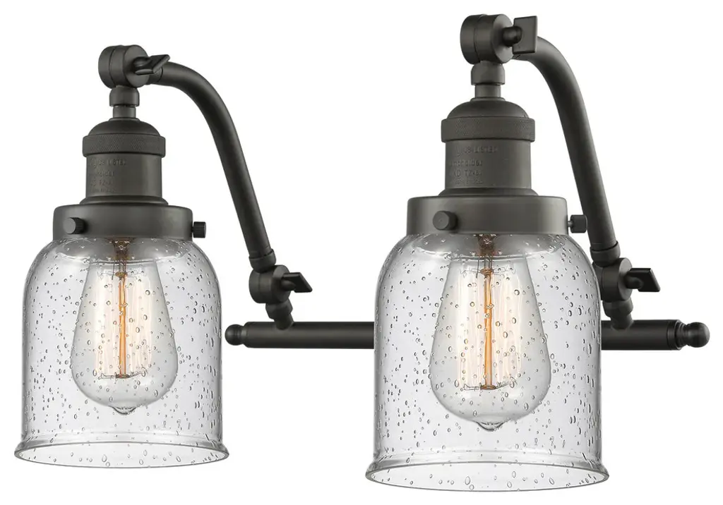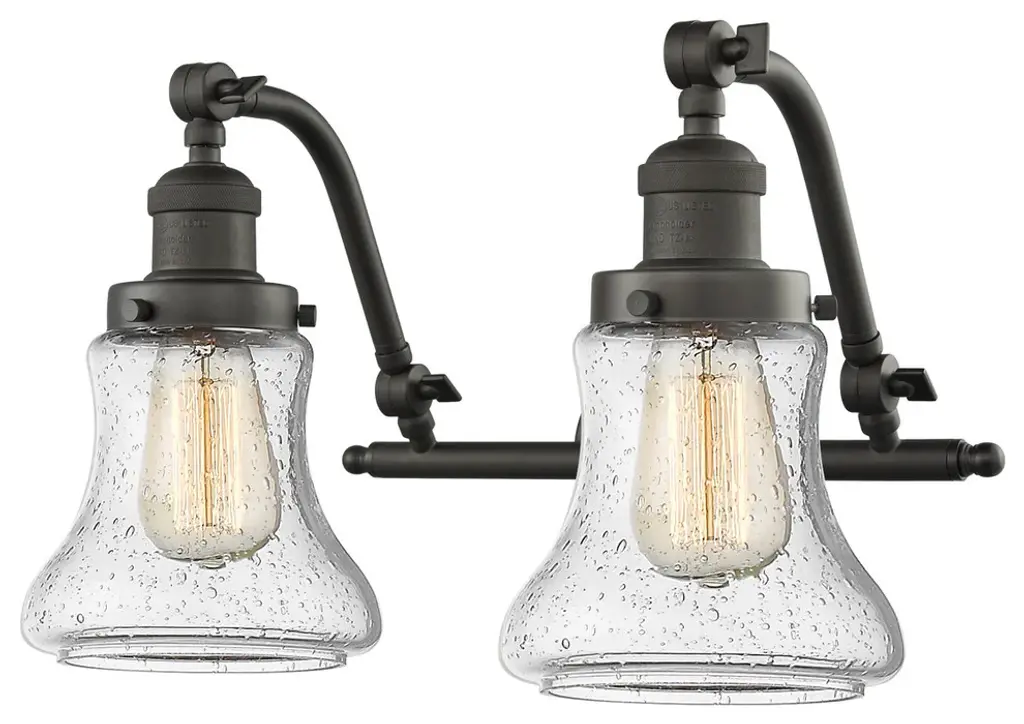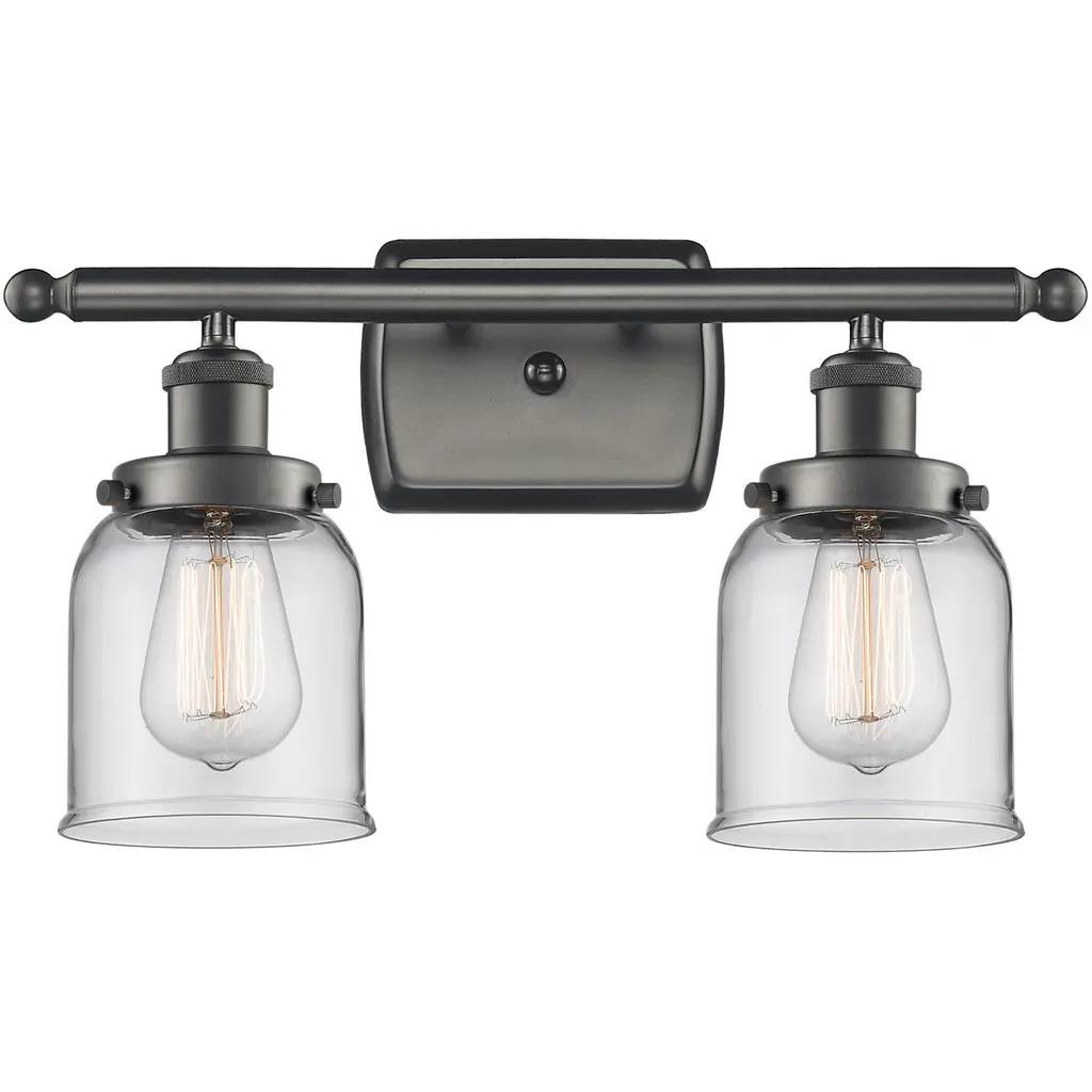 INNOVATIONS LIGHTING 515-2W-OB-G52-LED Small Bell 2 Light Bath Vanity Light part of the Franklin Restoration Collection. The Small Bell 2 Light Bath Vanity Light is part of the Franklin Restoration Collection.Solid Brass 180 Degree Adjustable Swivels with internal teeth that lock in at 5 degree intervals. Collection: Franklin Restoration. Material: Steel, Cast Brass, Glass. Metal Finish(Body): Oil Rubbed Bronze. Metal Finish(Canopy/Backplate): Oil Rubbed Bronze. Dimension(in): 18(W) x 12(H) x 10(Ext). Bulb: (2)3.5 Watt LED Vintage Medium Base Bulb Included,Dimmable. Color Temperature: 2700. Color Rendering Index(CRI): 82. Lumens): 350. Voltage: 120. Glass: Clear Small Bell/Transparent. Shade Shape: Bell. Shade Material: Glass. Shade Size(in): 5 X 5.75. Shade Fitter Measurement: 3.25 inch Fitter. Canopy Dimension(in): 4.5. Backplate Dimension(in): 4.5x0.75. Solid Brass 180 Degree Adjustable Swivels with internal teeth that lock in at 5 degree intervals. Fixture can be hung with bulbs facing up or down. UL/CUL Damp Rated. Warranty: 2 Year Finish, Lifetime Electrical.