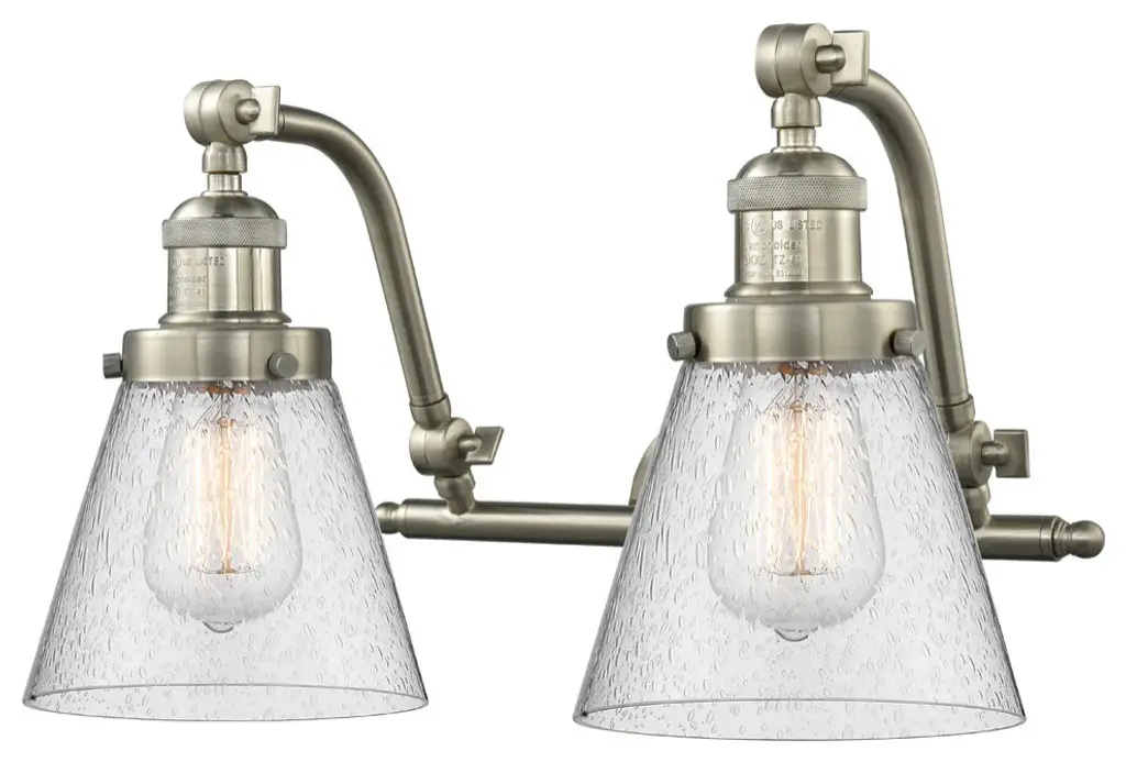 INNOVATIONS LIGHTING 515-2W-SN-G184-LED Canton 2 Light Bath Vanity Light part of the Franklin Restoration Collection. The Canton 2 Light Bath Vanity Light is part of the Franklin Restoration Collection.Solid Brass 180 Degree Adjustable Swivels with internal teeth that lock in at 5 degree intervals. Collection: Franklin Restoration. Material: Steel, Cast Brass, Glass. Metal Finish(Body): Brushed Satin Nickel. Metal Finish(Canopy/Backplate): Brushed Satin Nickel. Dimension(in): 18(W) x 12(H) x 10(Ext). Bulb: (2)3.5 Watt LED Vintage Medium Base Bulb Included,Dimmable. Color Temperature: 2700. Color Rendering Index(CRI): 82. Lumens): 350. Voltage: 120. Glass: Seedy Canton/Seeded. Shade Shape: Bell. Shade Material: Glass. Shade Size(in): 6 X 7.25. Shade Fitter Measurement: 3.25 inch Fitter. Canopy Dimension(in): 4.5. Backplate Dimension(in): 4.5x0.75. Solid Brass 180 Degree Adjustable Swivels with internal teeth that lock in at 5 degree intervals. Fixture can be hung with bulbs facing up or down. UL/CUL Damp Rated. Warranty: 2 Year Finish, Lifetime Electrical.