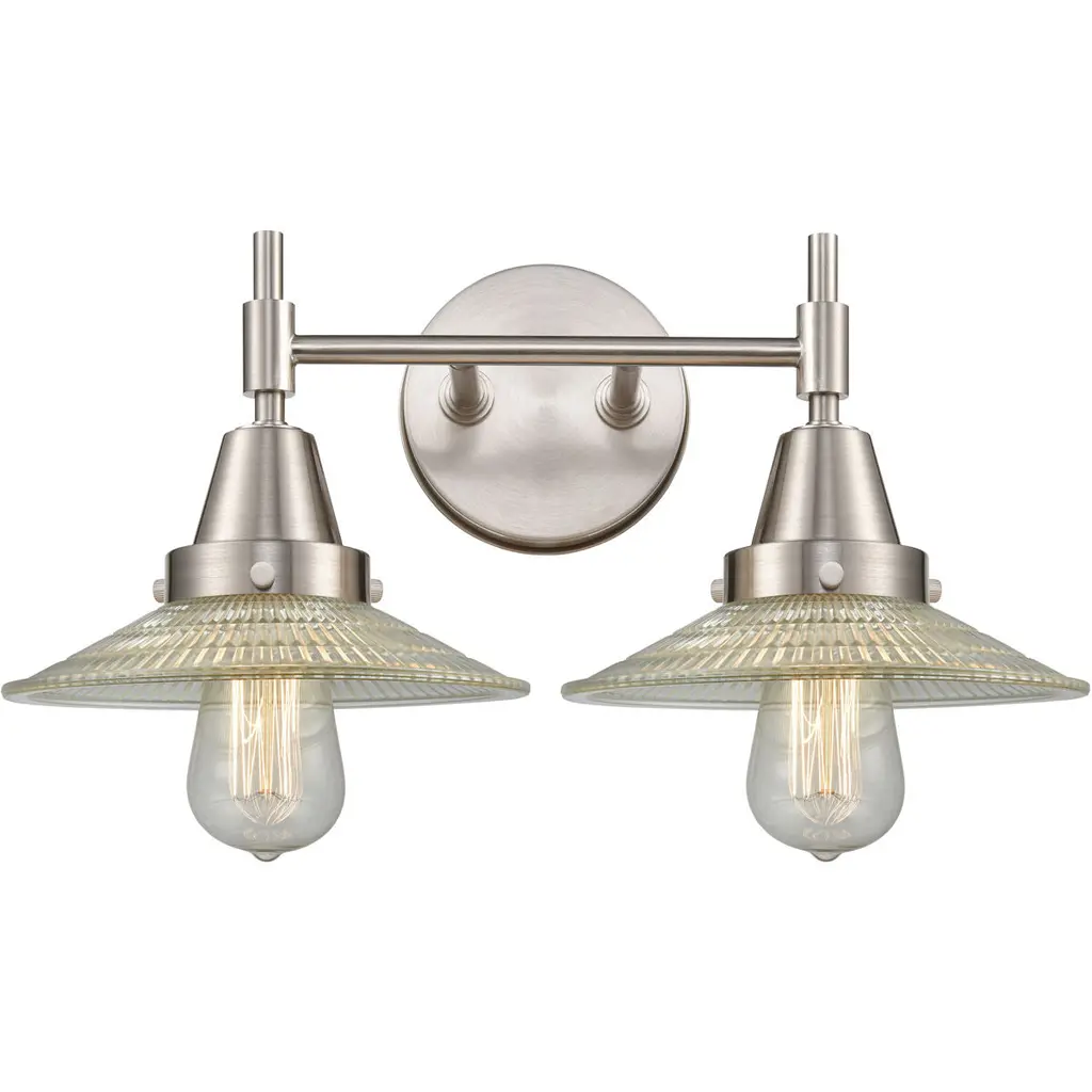 INNOVATIONS LIGHTING 515-2W-SN-G2-LED Halophane 2 Light Bath Vanity Light part of the Franklin Restoration Collection. The Halophane 2 Light Bath Vanity Light is part of the Franklin Restoration Collection.Solid Brass 180 Degree Adjustable Swivels with internal teeth that lock in at 5 degree intervals. Collection: Franklin Restoration. Material: Steel, Cast Brass, Glass. Metal Finish(Body): Brushed Satin Nickel. Metal Finish(Canopy/Backplate): Brushed Satin Nickel. Dimension(in): 18.25(W) x 12(H) x 10(Ext). Bulb: (2)3.5 Watt LED Vintage Medium Base Bulb Included,Dimmable. Color Temperature: 2700. Color Rendering Index(CRI): 82. Lumens): 350. Voltage: 120. Glass: Clear Halophane/Transparent. Shade Shape: Cone. Shade Material: Glass. Shade Size(in): 9 X 2. Shade Fitter Measurement: 3.25 inch Fitter. Canopy Dimension(in): 4.5. Backplate Dimension(in): 4.5x0.75. Solid Brass 180 Degree Adjustable Swivels with internal teeth that lock in at 5 degree intervals. Fixture can be hung with bulbs facing up or down. UL/CUL Damp Rated. Warranty: 2 Year Finish, Lifetime Electrical.