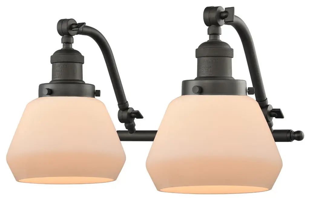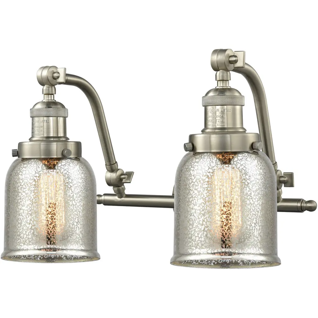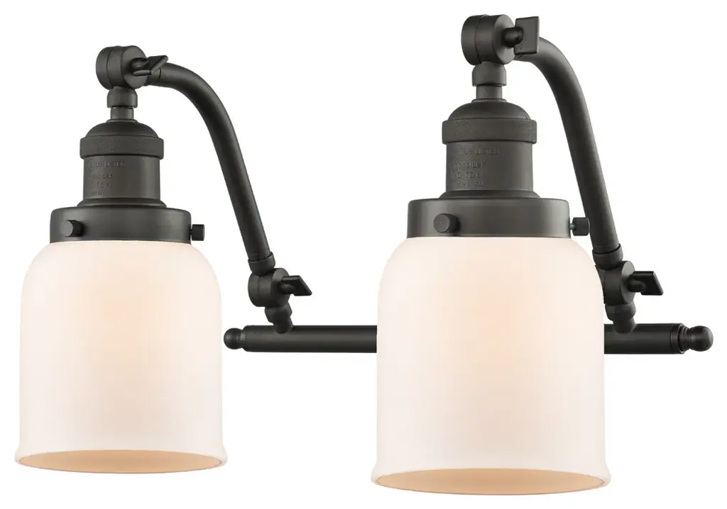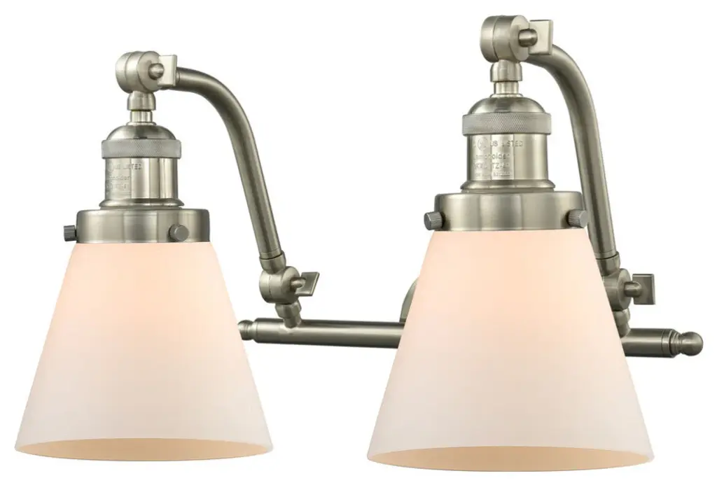 INNOVATIONS LIGHTING 515-2W-SN-G61-LED Small Cone 2 Light Bath Vanity Light part of the Franklin Restoration Collection. The Small Cone 2 Light Bath Vanity Light is part of the Franklin Restoration Collection.Solid Brass 180 Degree Adjustable Swivels with internal teeth that lock in at 5 degree intervals. Collection: Franklin Restoration. Material: Steel, Cast Brass, Glass. Metal Finish(Body): Brushed Satin Nickel. Metal Finish(Canopy/Backplate): Brushed Satin Nickel. Dimension(in): 18(W) x 12(H) x 10(Ext). Bulb: (2)3.5 Watt LED Vintage Medium Base Bulb Included,Dimmable. Color Temperature: 2700. Color Rendering Index(CRI): 82. Lumens): 350. Voltage: 120. Glass: Matte White Cased Small Cone/Frosted. Shade Shape: Cone. Shade Material: Glass. Shade Size(in): 6.25 X 5.75. Shade Fitter Measurement: 3.25 inch Fitter. Canopy Dimension(in): 4.5. Backplate Dimension(in): 4.5x0.75. Solid Brass 180 Degree Adjustable Swivels with internal teeth that lock in at 5 degree intervals. Fixture can be hung with bulbs facing up or down. UL/CUL Damp Rated. Warranty: 2 Year Finish, Lifetime Electrical.