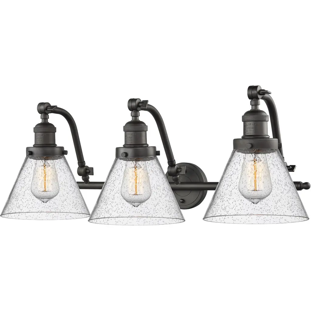 INNOVATIONS LIGHTING 515-3W-OB-G44-LED Large Cone 3 Light Bath Vanity Light part of the Franklin Restoration Collection. The Large Cone 3 Light Bath Vanity Light is part of the Franklin Restoration Collection.Solid Brass 180 Degree Adjustable Swivels with internal teeth that lock in at 5 degree intervals. Collection: Franklin Restoration. Material: Steel, Cast Brass, Glass. Metal Finish(Body): Oil Rubbed Bronze. Metal Finish(Canopy/Backplate): Oil Rubbed Bronze. Dimension(in): 28(W) x 12(H) x 10(Ext). Bulb: (3)3.5 Watt LED Vintage Medium Base Bulb Included,Dimmable. Color Temperature: 2700. Color Rendering Index(CRI): 82. Lumens): 350. Voltage: 120. Glass: Seedy Large Cone/Seeded. Shade Shape: Cone. Shade Material: Glass. Shade Size(in): 7.75 X 6. Shade Fitter Measurement: 3.25 inch Fitter. Canopy Dimension(in): 4.5. Backplate Dimension(in): 4.5x0.75. Solid Brass 180 Degree Adjustable Swivels with internal teeth that lock in at 5 degree intervals. Fixture can be hung with bulbs facing up or down. UL/CUL Damp Rated. Warranty: 2 Year Finish, Lifetime Electrical.
