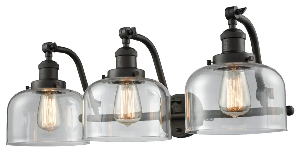 INNOVATIONS LIGHTING 515-3W-OB-G62-LED Small Cone 3 Light Bath Vanity Light part of the Franklin Restoration Collection. The Small Cone 3 Light Bath Vanity Light is part of the Franklin Restoration Collection.Solid Brass 180 Degree Adjustable Swivels with internal teeth that lock in at 5 degree intervals. Collection: Franklin Restoration. Material: Steel, Cast Brass, Glass. Metal Finish(Body): Oil Rubbed Bronze. Metal Finish(Canopy/Backplate): Oil Rubbed Bronze. Dimension(in): 28(W) x 12(H) x 10(Ext). Bulb: (3)3.5 Watt LED Vintage Medium Base Bulb Included,Dimmable. Color Temperature: 2700. Color Rendering Index(CRI): 82. Lumens): 350. Voltage: 120. Glass: Clear Small Cone/Transparent. Shade Shape: Cone. Shade Material: Glass. Shade Size(in): 6.25 X 5.75. Shade Fitter Measurement: 3.25 inch Fitter. Canopy Dimension(in): 4.5. Backplate Dimension(in): 4.5x0.75. Solid Brass 180 Degree Adjustable Swivels with internal teeth that lock in at 5 degree intervals. Fixture can be hung with bulbs facing up or down. UL/CUL Damp Rated. Warranty: 2 Year Finish, Lifetime Electrical.