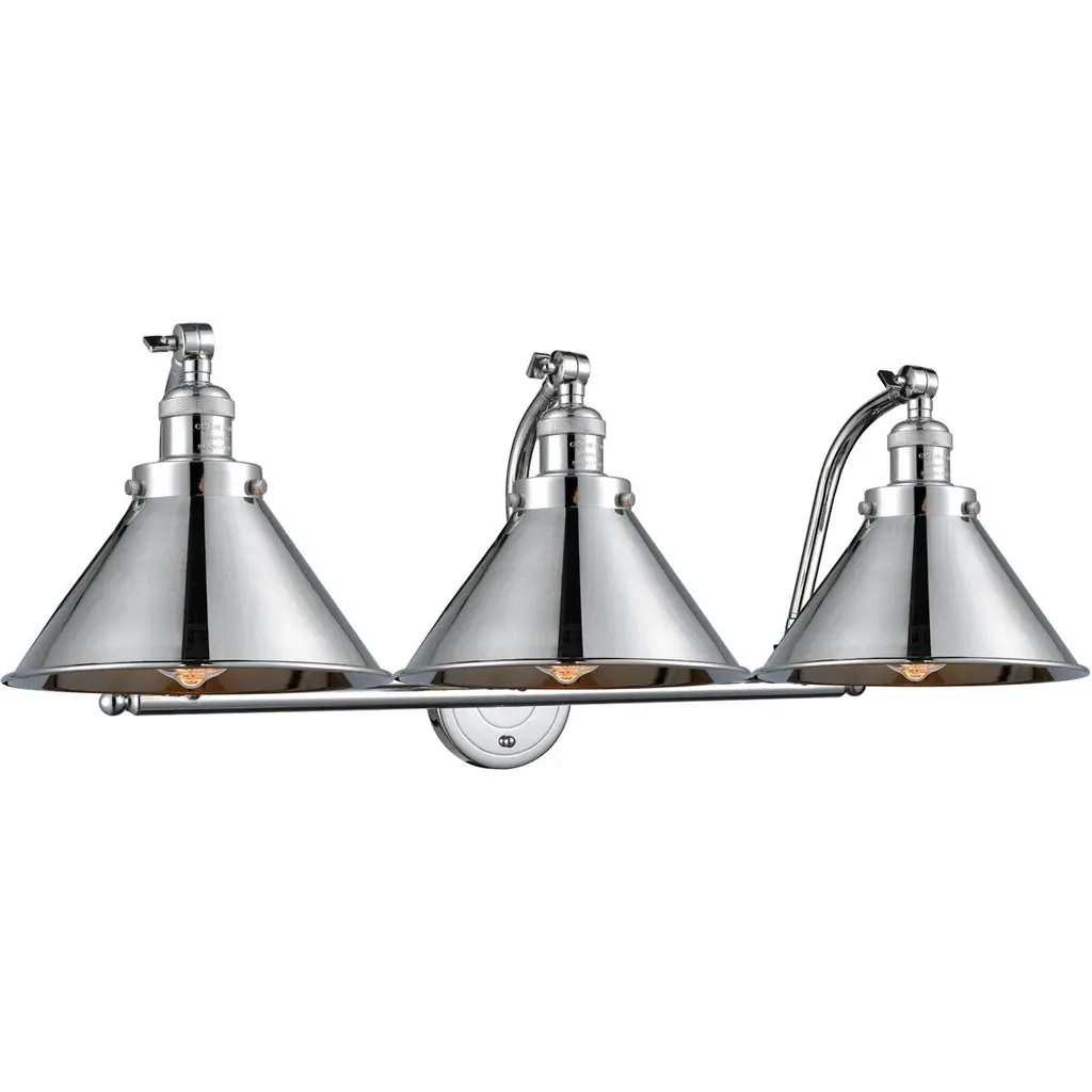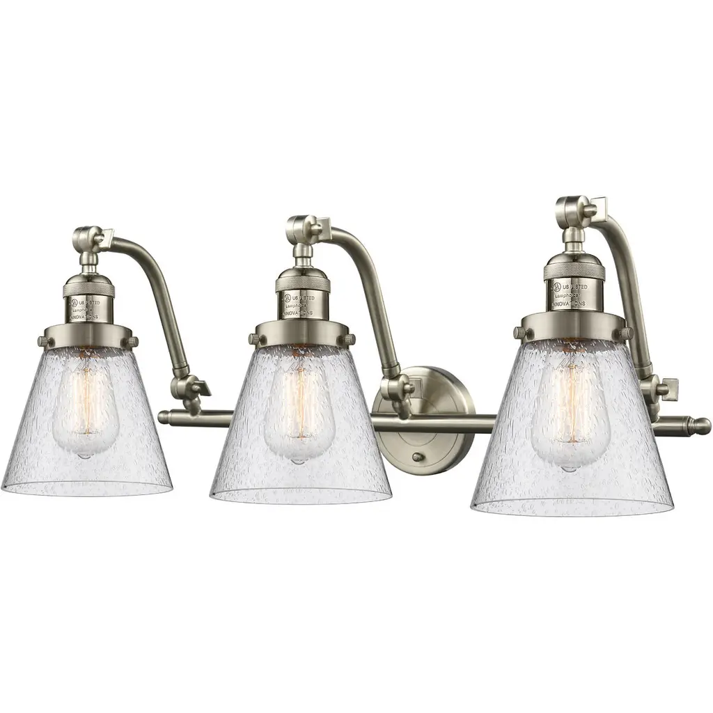 INNOVATIONS LIGHTING 515-3W-SN-M10-LED 3 Light Vintage Dimmable LED Bathroom Fixture. Briarcliff 3-Vintage Dimmable LED 28 inch Brushed Satin Nickel Bathroom Fixture with Brushed Satin Nickel Briarcliff shades and Solid Brass 180 Degree Adjustable Swivels. Collection: Briarcliff. Metal Finish: Brushed Satin Nickel. Material: Cast Brass. Glass/Metal Shade Color: Brushed Satin Nickel. Metal Shade Description: Brushed Satin Nickel Briarcliff. Dimension(in): 28(W) x 12(H) x 10(Ext). Glass Shade Dimension(in): 10 X 5.5. Shade Fitter Size: 3.25 inch Fitter. Canopy Dimension(in): 4.5(Dia). Backplate Dimension(in): 4.5(Dia) x 0.75(Depth). Bulb: (3)3 Watt LED Vintage Medium Base Bulb Included. Max Watts Per Socket: 100. Color Temperature: 3000 Kelvin. Lumens: 265. CRI: 80. UL Certification Type: Damp Location. ETL Certification Type: Damp Location. Reversible(can be hung with bulbs facing up or down): Yes.