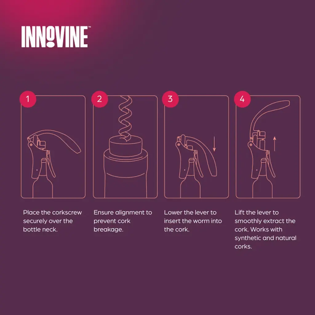 Open wine bottles with ease using the Innovine Vertical Corkscrew Wine Opener, designed for smooth, two-step uncorking. The gear-driven, non-stick worm centers perfectly on wine bottles, preventing broken wine corks and awkward angles. Its easy-motion lever handle delivers satisfying pull power, while the secure neck fit keeps every pour clean and controlled. Crafted from durable and heavyweight materials, this compact corkscrew wine opener manual transitions effortlessly from drawer to patio, making it a standout among kitchen gadgets and home bar tools. Whether you're hosting dinner, packing for travel, or planning an outdoor party or weekend picnic, it’s a smart addition to household essentials and bar accessories. Fits neatly into your kitchen bar setup or bar cart accessories lineup, and doubles as a clever pick for wine gifts, housewarming gifts, hostess gifts, or birthday gifts. From holiday entertaining to wedding gifts, this lever corkscrew brings style, function, and celebration to your wine accessories collection. A must have for anyone who loves to entertain, it makes uncorking feel like part of the ritual.