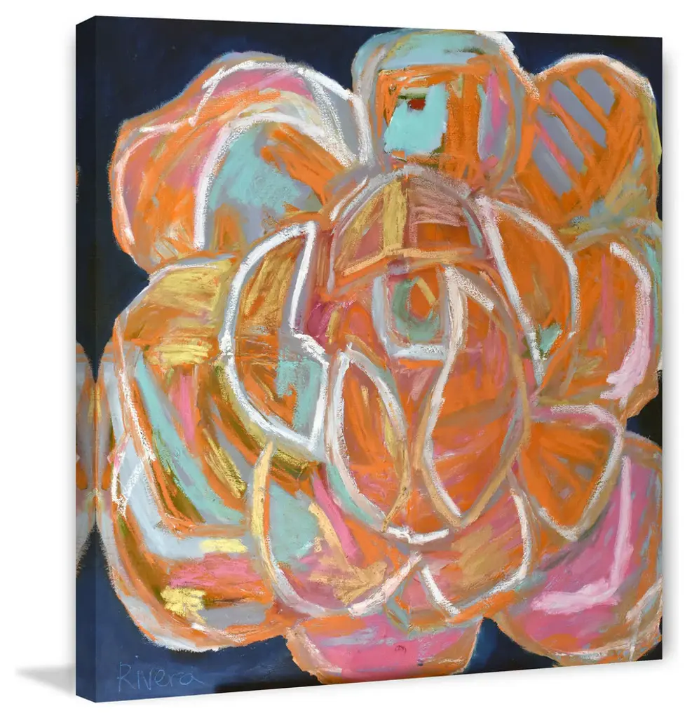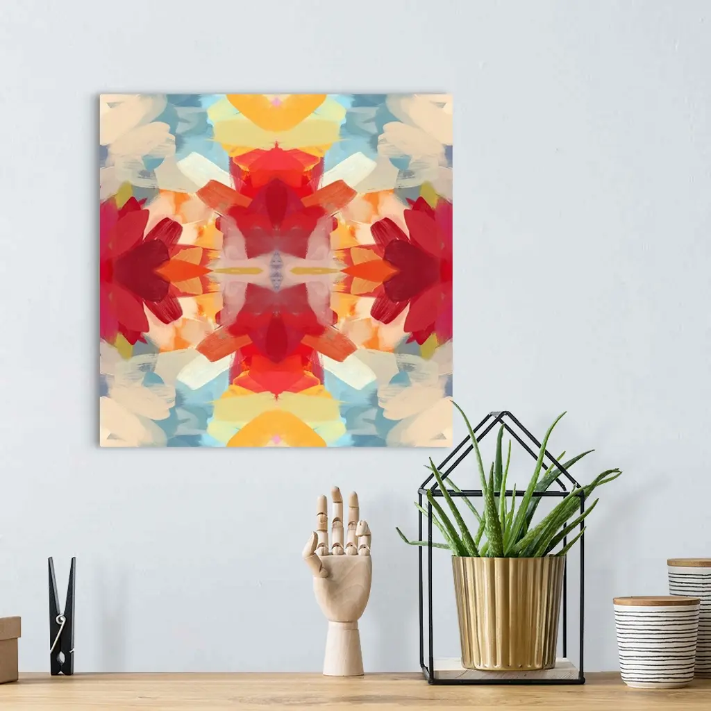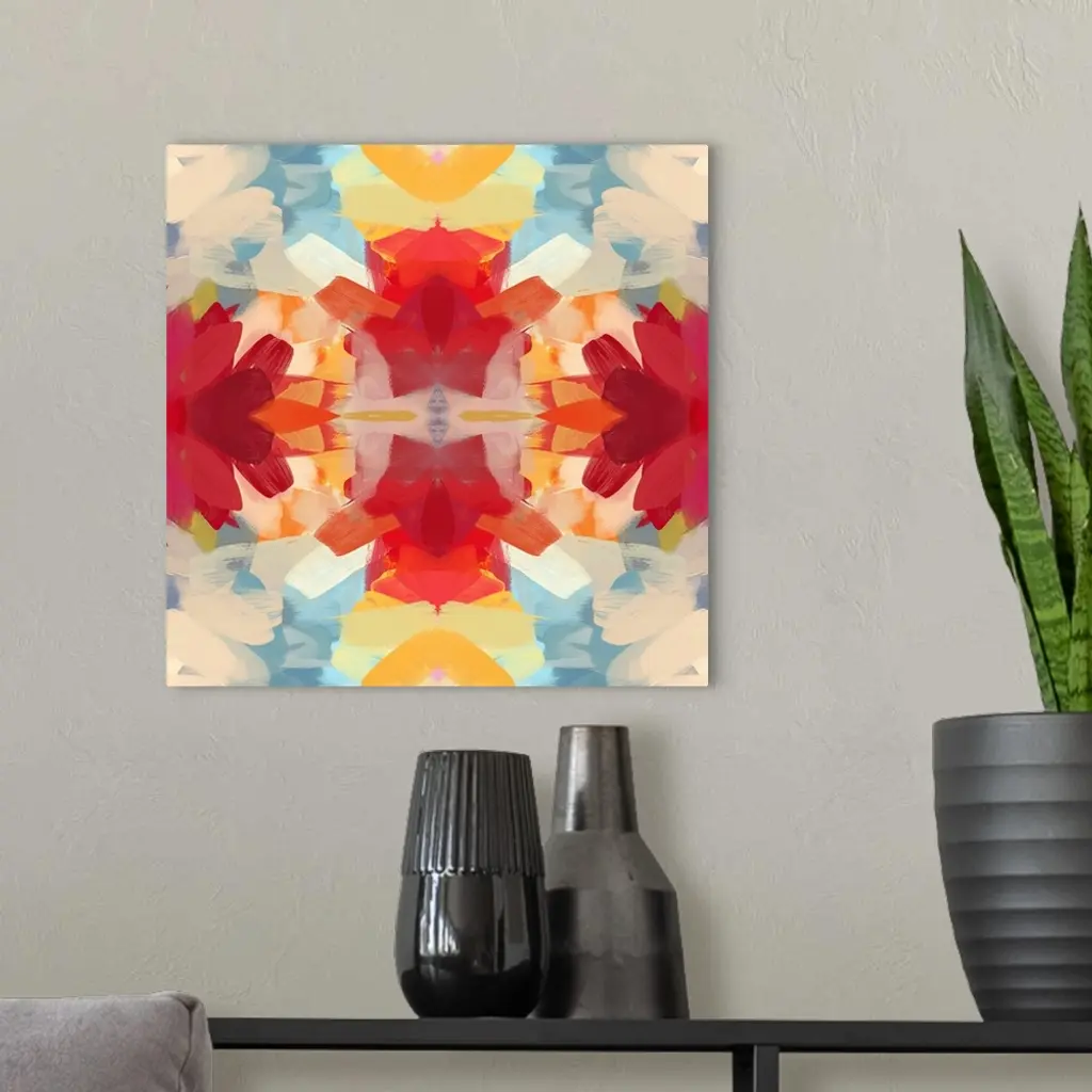 Kaleidoscopic abstract pattern in shades of red, orange, and blue.