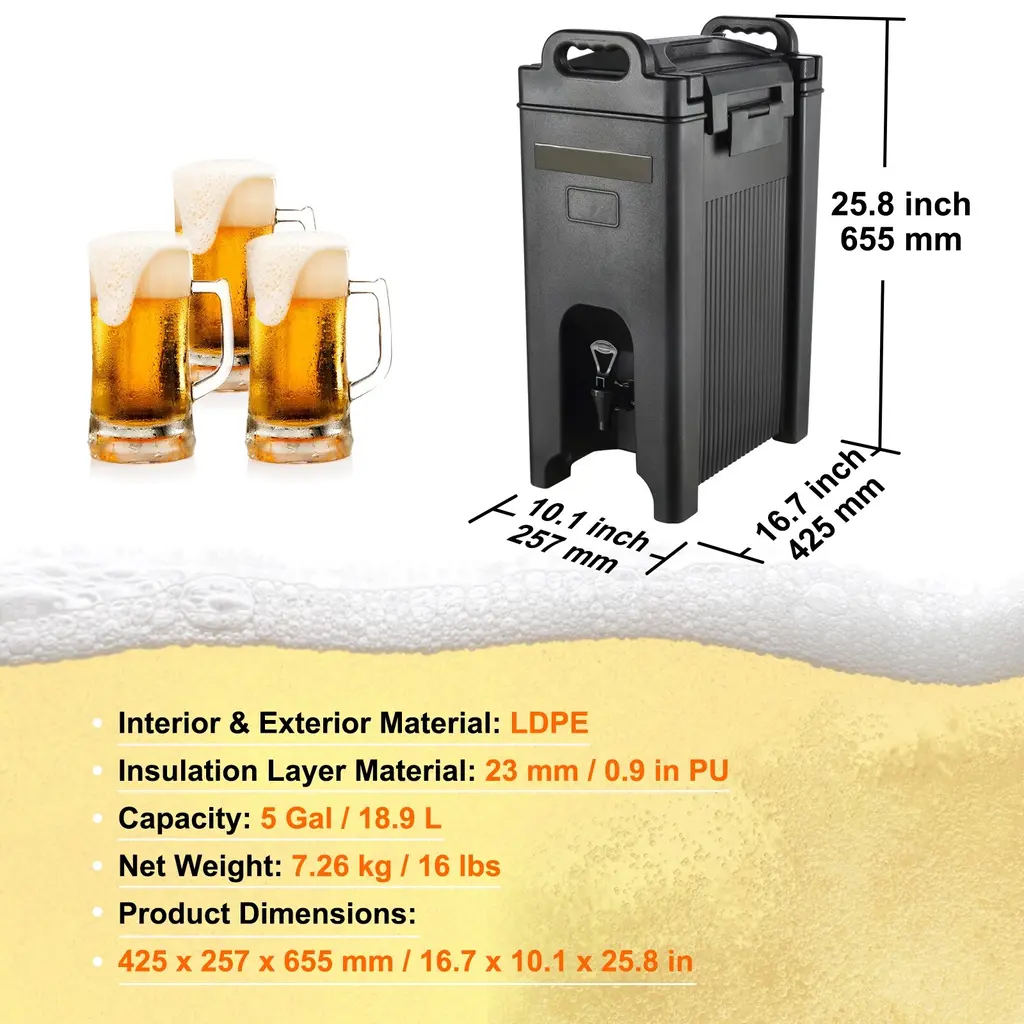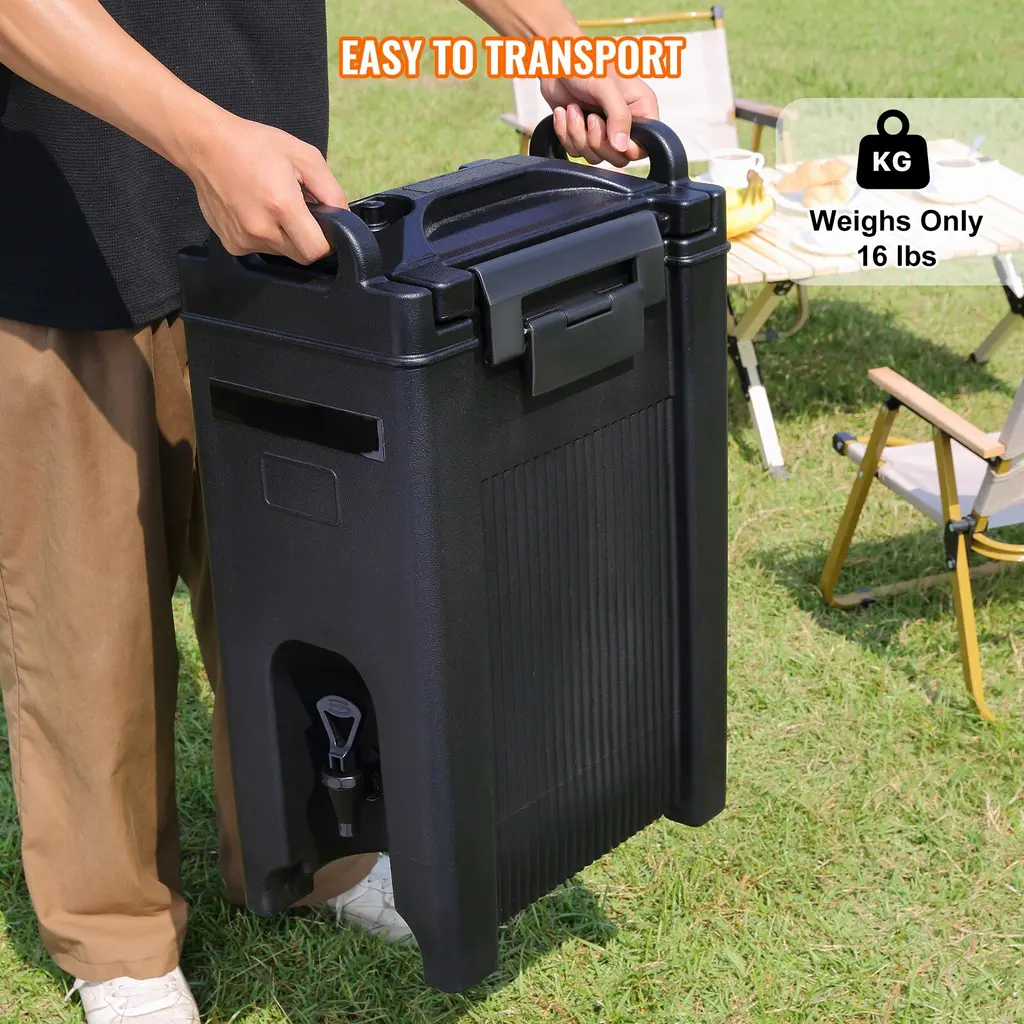 2.5-10 Gal Large Capacity: Introducing our 2.5-10 gallon high-capacity insulated beverage dispenser, designed to keep your hot or cold beverages, such as juice, coffee, milk, and tea, at the perfect temperature. We take pride in using food-grade materials for all components that come in contact with your beverages. Experience the ultimate in beverage service quality! Non-Electric Insulation: Crafted with an LDPE surface and a 0.9/0.87/1.18 in (23 mm) PU foam layer, our hot and cold beverage dispenser is your go-to for exceptional insulation. It keeps your drinks at the ideal temperature for over 10 hours without requiring electricity or any external power source. The two integrated nylon latches securely tighten the lid, locking in the desired internal temperature. Two-Stage Spigot: Our drip-proof two-stage spigot allows for precise control of the beverage flow, and it even features an effortless press-to-stay-open function. Composed of food-grade PP material, our insulated drink dispenser is built for longevity, and its internal springs and washers avoid leaks. Say goodbye to concerns about leaks or deformation. Hassle-Free Mobility: Our thermal beverage dispenser is made from lightweight materials and weighs just 16 lbs/6.6 lbs/10.8 lbs/23.8 lbs. The two ergonomically designed integrated handles align perfectly with your fingers, making it a breeze for you to lift and carry anywhere you want. Versatile Usability: Our hot and cold beverage server is your perfect companion, suitable for cafes, bars, entertainment venues, restaurants, and more. Whether it is coffee, juice, tea, or more, it will elevate your beverage service. Experience the perfect blend of capacity, insulation, and convenience. Elevate your beverage game today! Package Content 1 x Insulated Beverage Dispenser 2 x Large Rubber Washer 1 x Small Rubber Washer 1 x User Manual (1 x Insulated Beverage Dispenser) for 4.5 gal option (1 x Insulated Beverage Dispenser 1 x Handle 5 x Screws 1 x 2 mm Washer) for 10 gal option