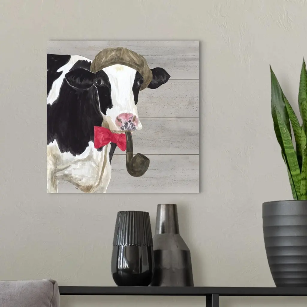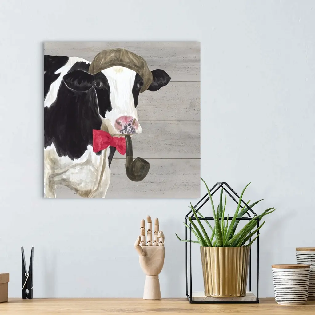 A black and white cow with a hat on head and pipe in mouth against of grey wood background.