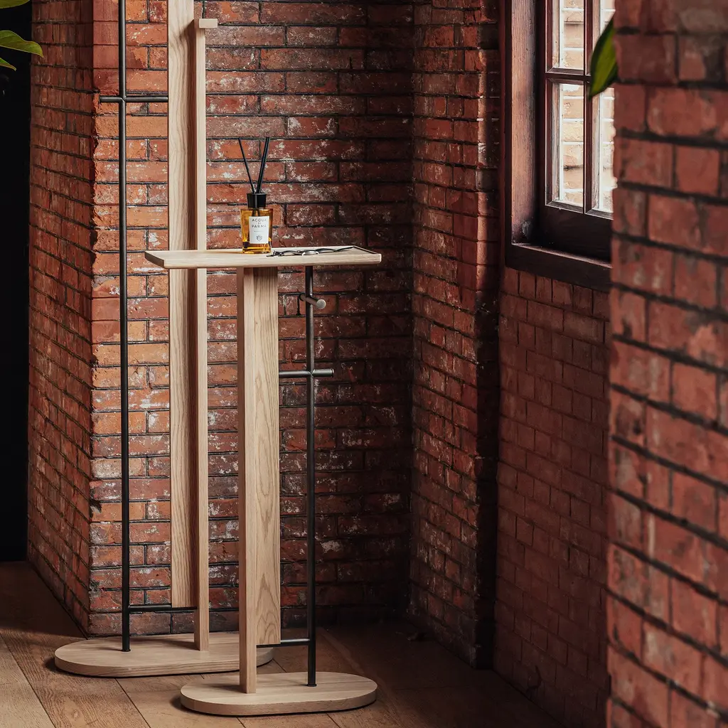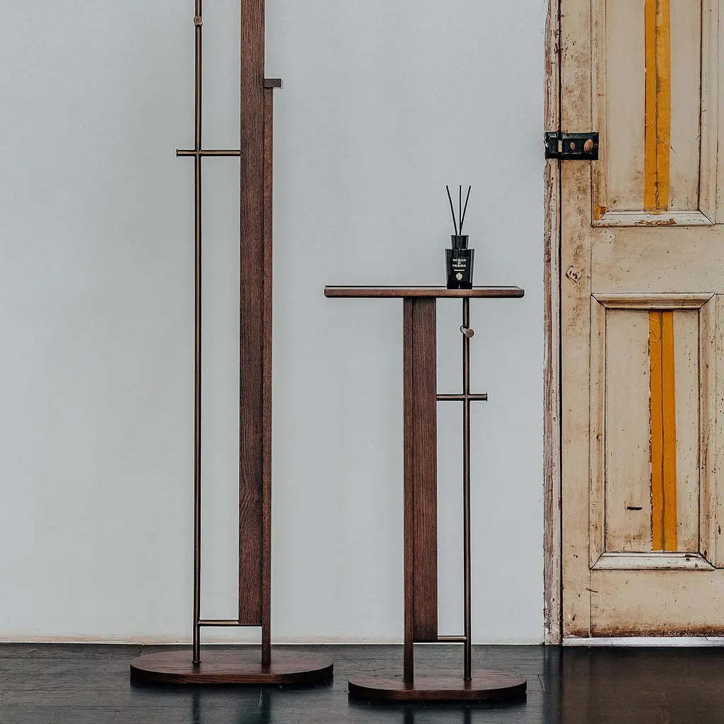Crafted with a sculptural sensibility, the Inter Console features a slim vertical plank of solid wood rising from an oval base, intersected by two powder-coated metal arms that seamlessly merge surface and structure. The compact top offers a discreet area for display, while the metal bars provide space for hanging small items. Rich wood finishes.