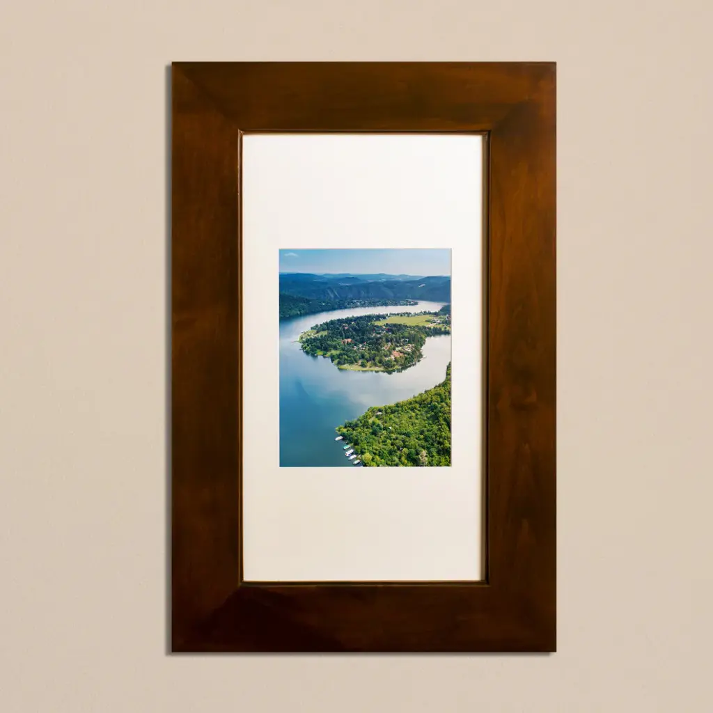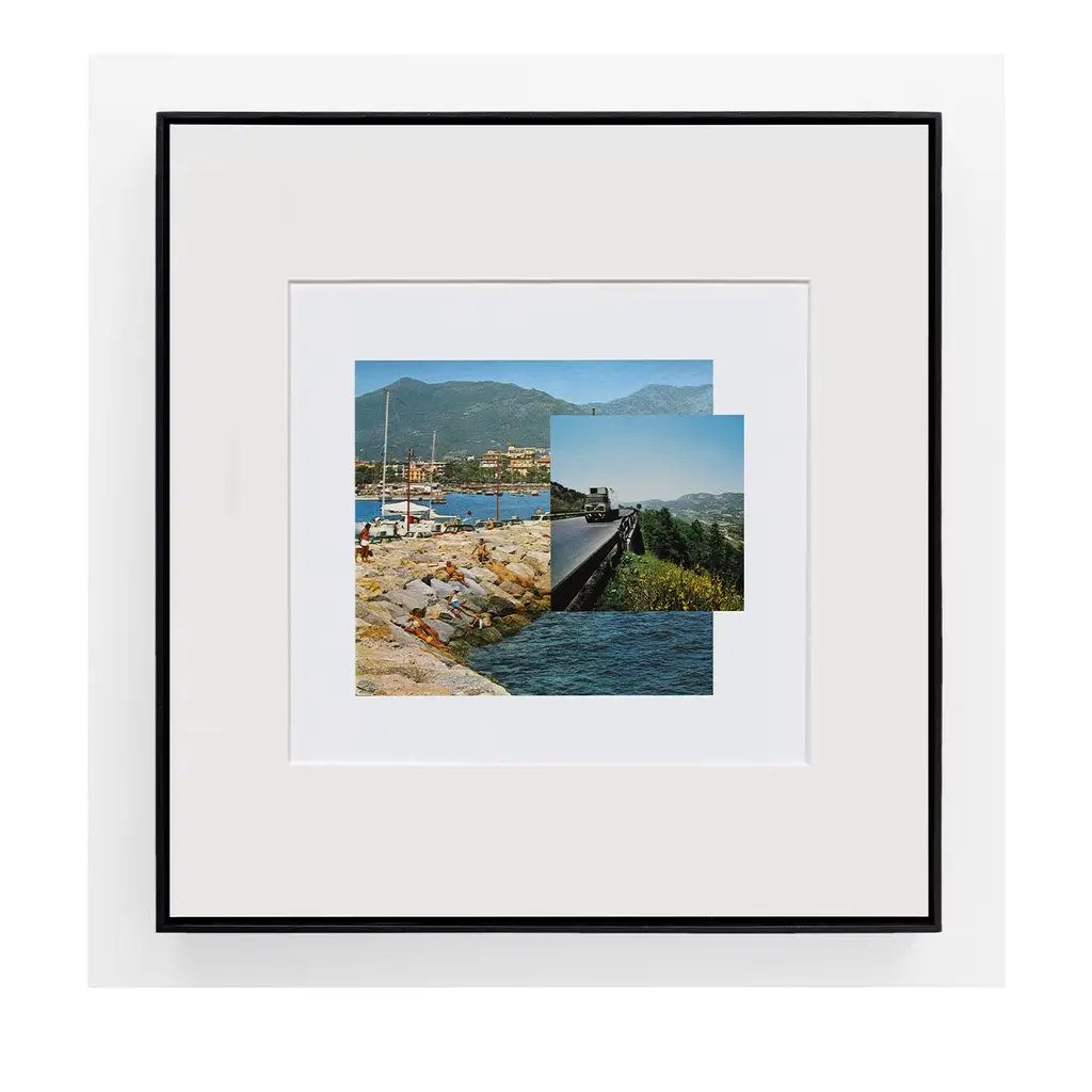 Part of the "Interazione visiva di paesaggio con scambio temporale di ruoli/azioni" series, this photographic collage focuses on specularity. The reflection offered by the water's surface at the top harmonizes with the body of water in the image below, since the reflected greenery seems to coherently replace a mountain profile, an optical effect that adds to the specular suggestion.